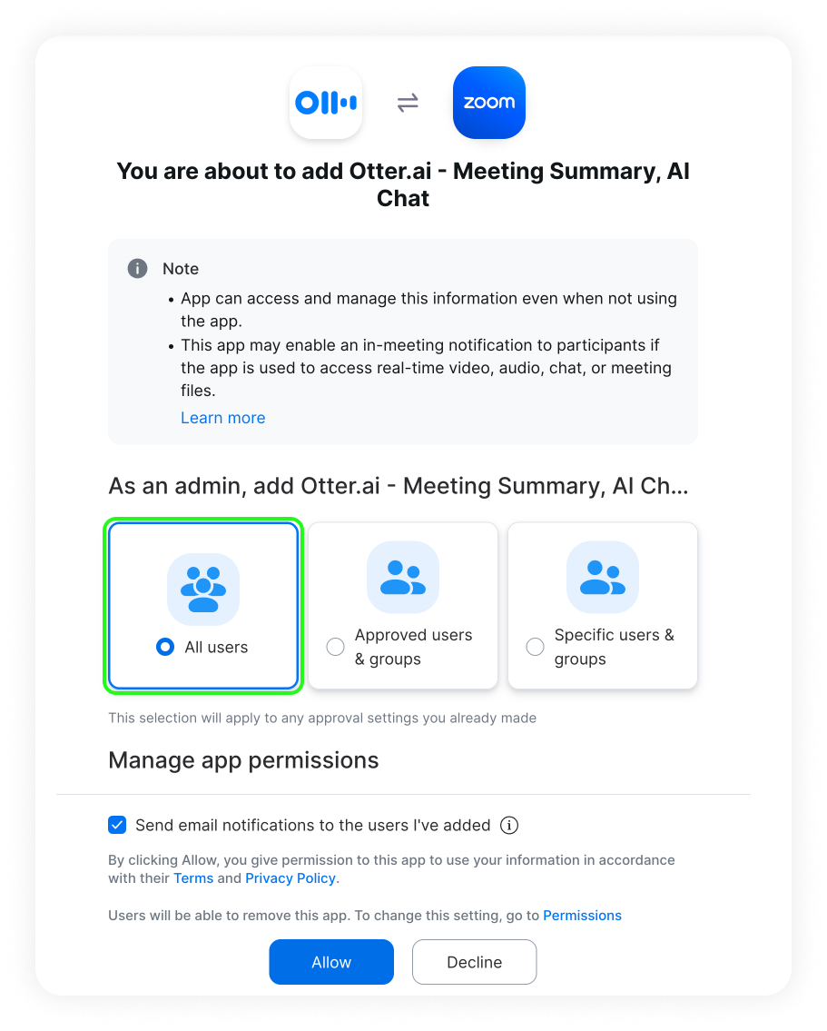Note: We recommend selecting All users to ensure each member can connect Zoom to their Otter account.