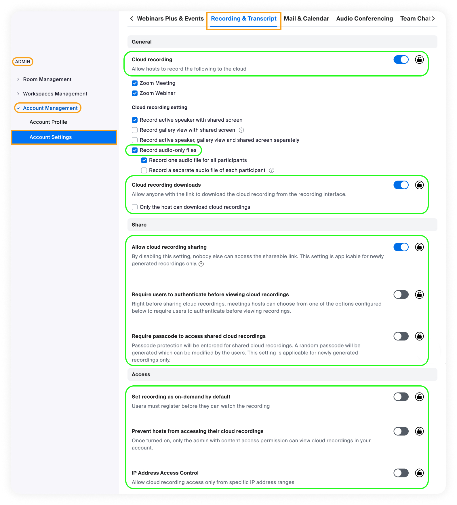 Step 2: Enable Cloud Recording settings for your Zoom workspace (Admin)