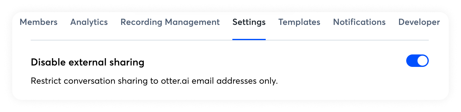 Otter provides control over how users in the workspace can share their conversations. When this feature is enabled, users will only be able to share with people in the same workspace domain. This prevents users from sharing conversations outside of the organization.