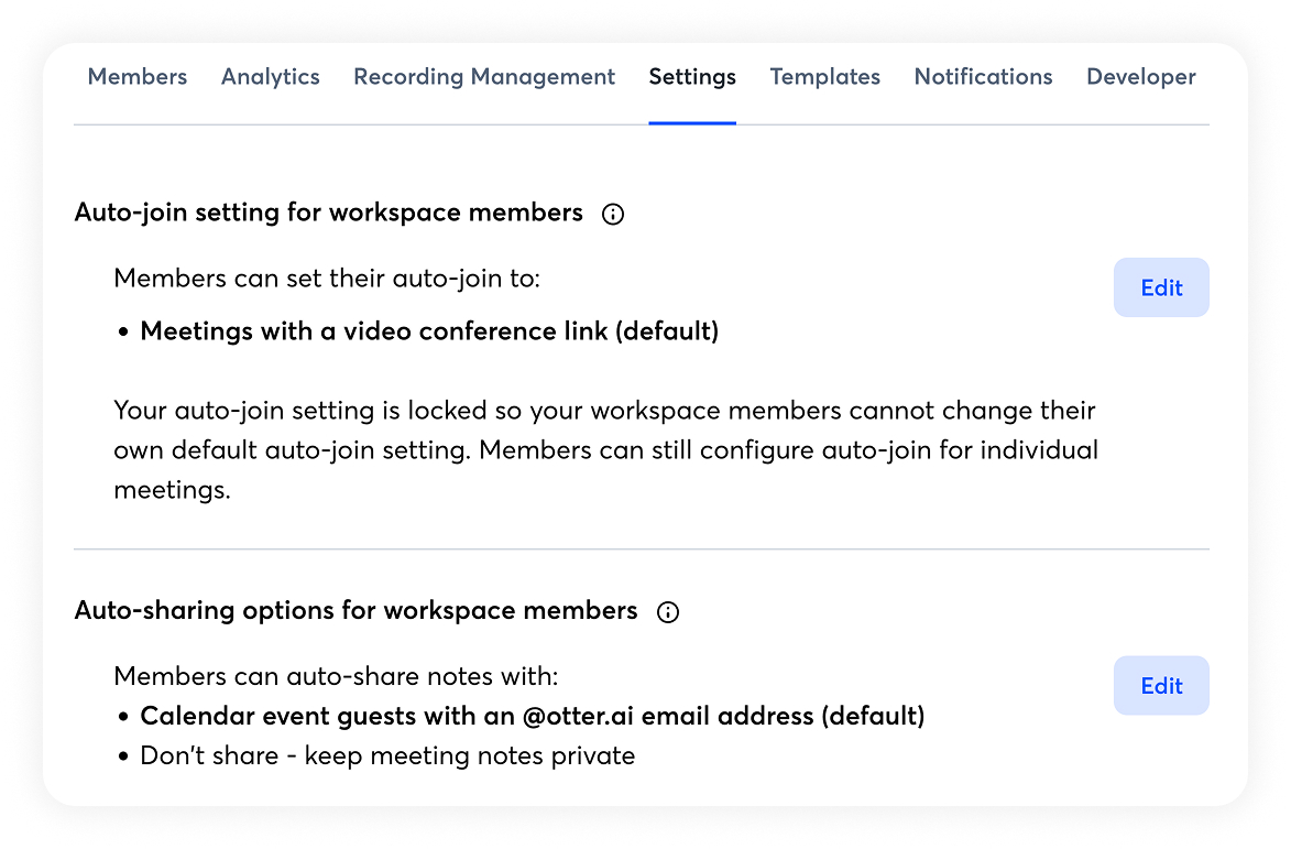 Manage conversation sharing and Notetaker auto-join settings in your workspace. To manage, navigate to Workspace > Manage workspace > Settings. Learn more about managing workspace settings.