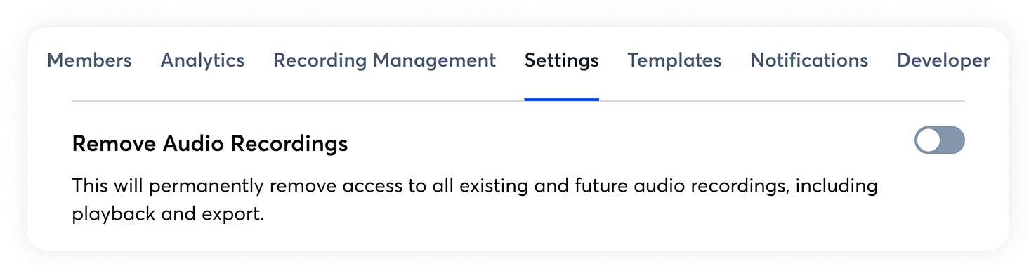 To turn this feature on, navigate to Workspace > Manage workspace > Settings. Under Remove audio recordings, toggle the setting on: