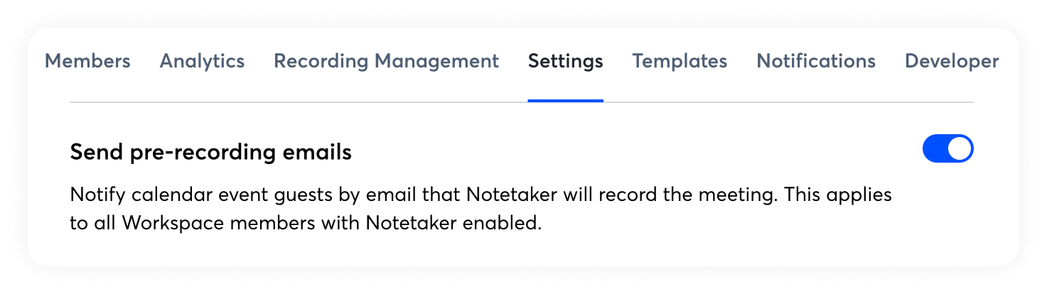 Notifying all invited meeting attendees is a great way to ensure everyone is aware they are being recorded. We always recommend obtaining user permissions before recording and ensuring compliance with local laws governing recordings. Turning on this feature applies to all users in your workspace and sends an email to all invited attendees on the meeting list, notifying them that Notetaker will be recording. Please note the following:
