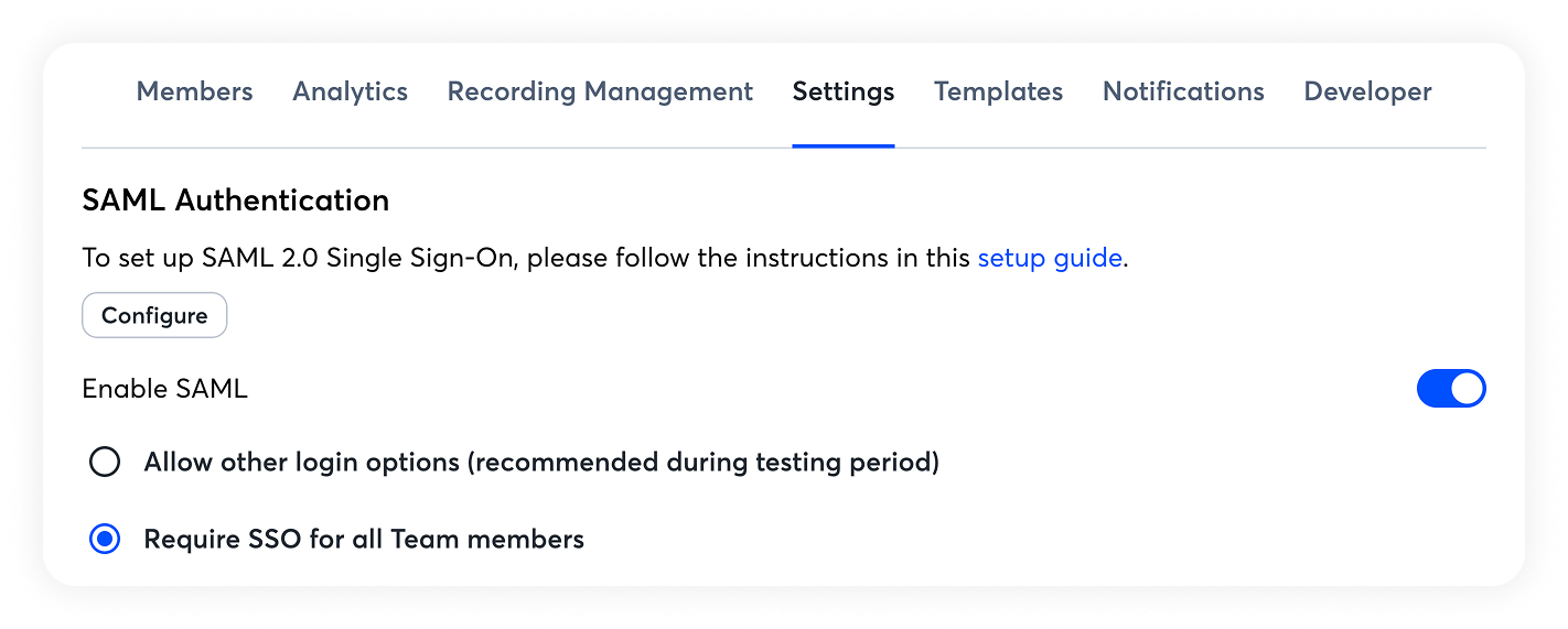 Set up SAML Single Sign-On (SSO) to allow your team to securely access Otter using your organization’s identity provider. To enable SSO, navigate to Workspace > Manage Workspace > Settings > SAML Authentication, where you can configure and activate SAML for your workspace. Learn more about setting up SSO.