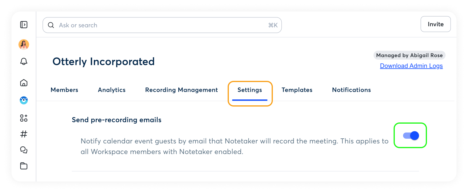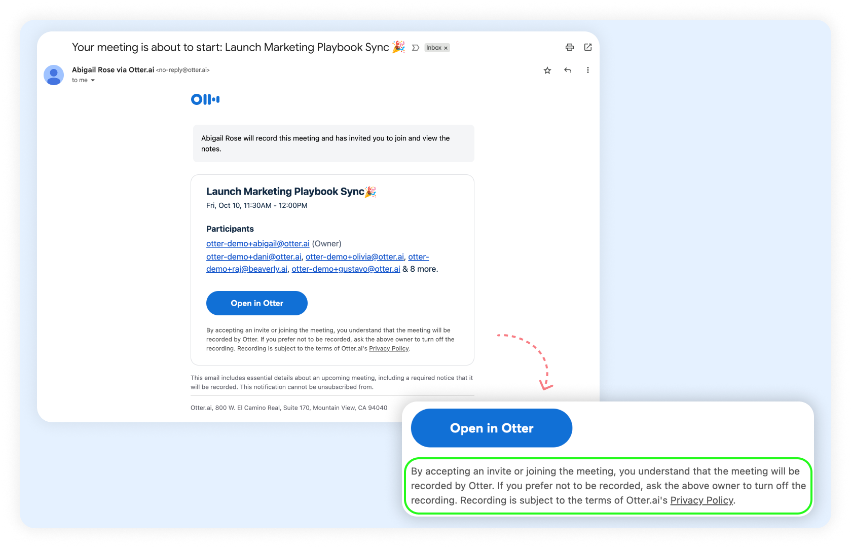 Turning on this feature will apply to all users in your Workspace, and will send out an email to all invited attendees on the meeting list, notifying them that OtterPilot will be recording. Please note the following: