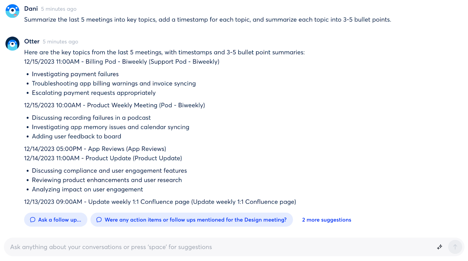 - Summarize the last 5 meetings into key topics, add a timestamp for each topic, and summarize each topic into 3-5 bullet points.