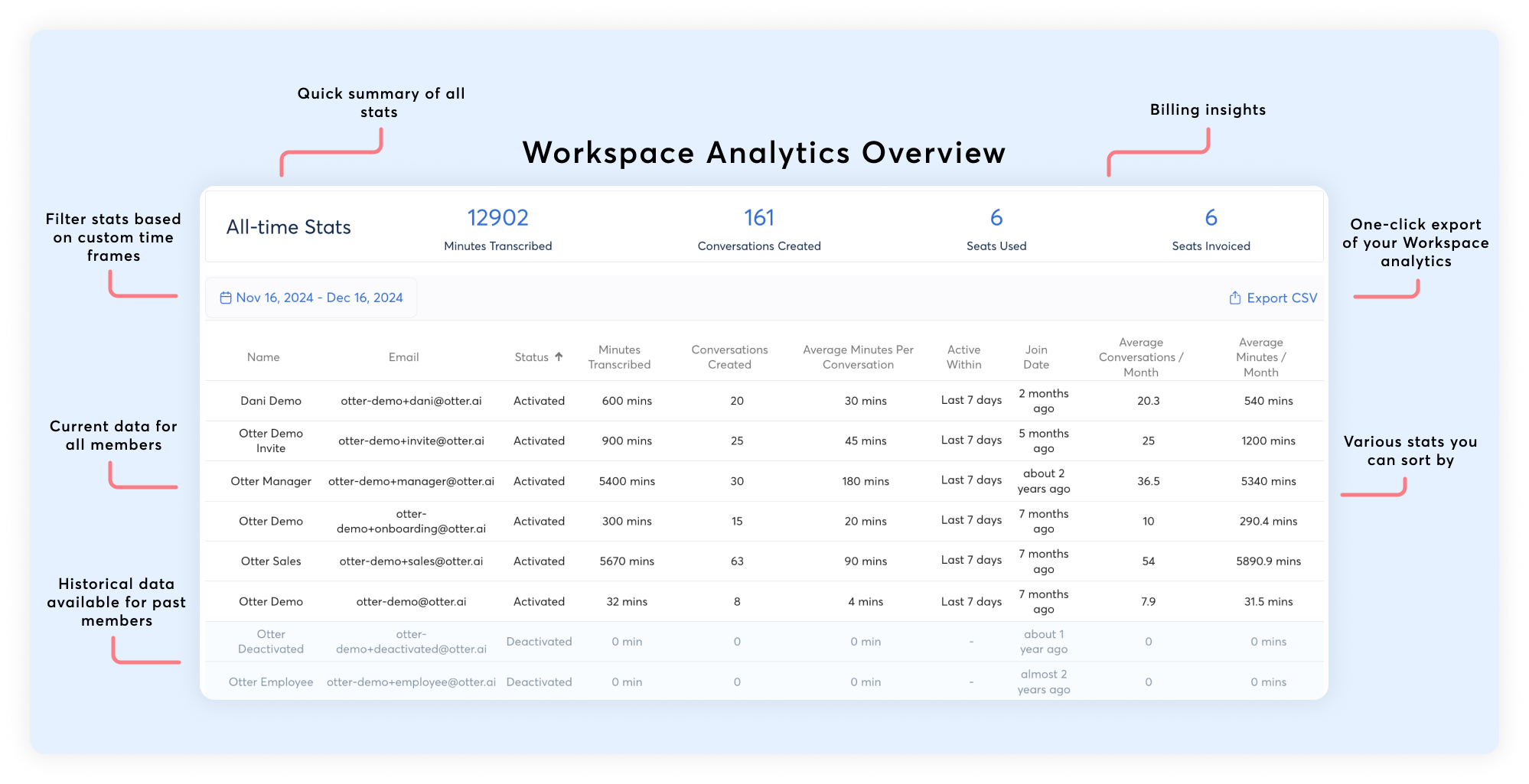Otter Analytics provides admins with insights and data about their team members' activity within the Workspace. Monitor, analyze, and view usage trends over a period of time.