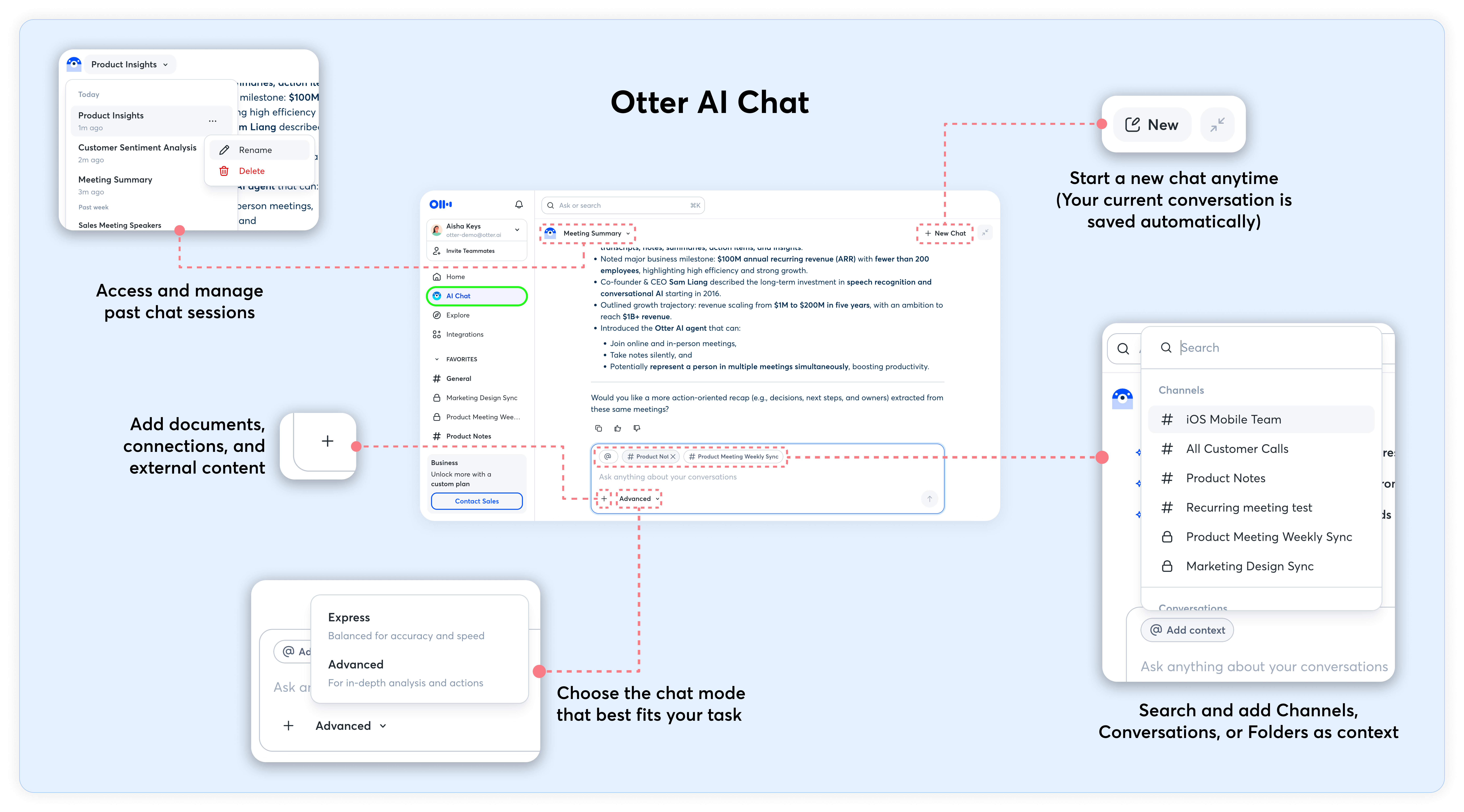 AI Chat works across all of your conversations in Otter, including meetings shared with you. It can answer questions about past meetings, provide context from channels, and help you quickly find important information without manually searching transcripts. AI Chat is available during live meetings and after meetings end, so you can continue asking questions and generating insights at any time.