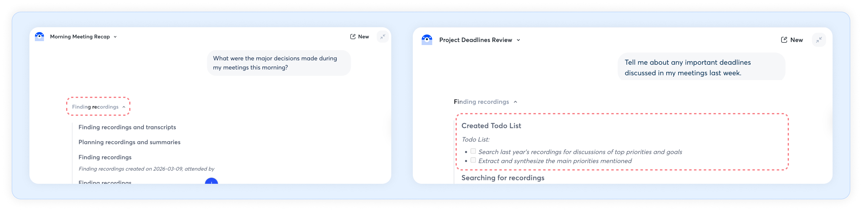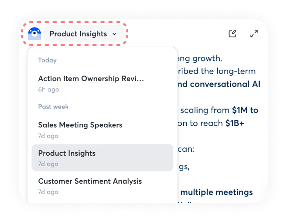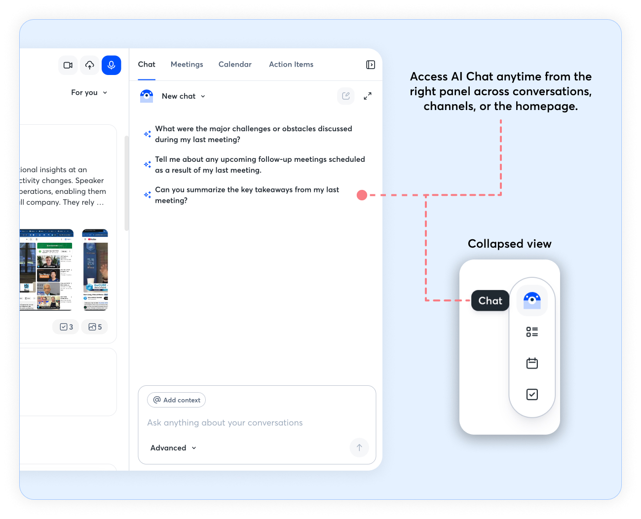 AI Chat automatically understands the content you’re viewing and uses that context to generate more relevant responses. Whether you’re in a live meeting or reviewing a past conversation, AI Chat provides answers tailored to you.