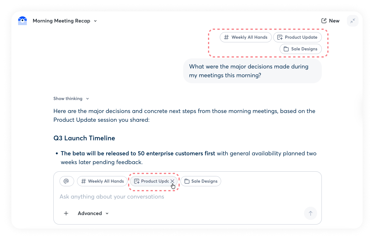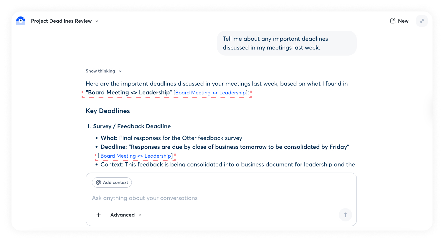 For every response, you can see the sources AI Chat used to generate its answer. Click on any of the added context to view the source directly. Otter lets you add or remove conversations, channels, or folders within the same chat session, so you can refine context as you ask questions and uncover insights.