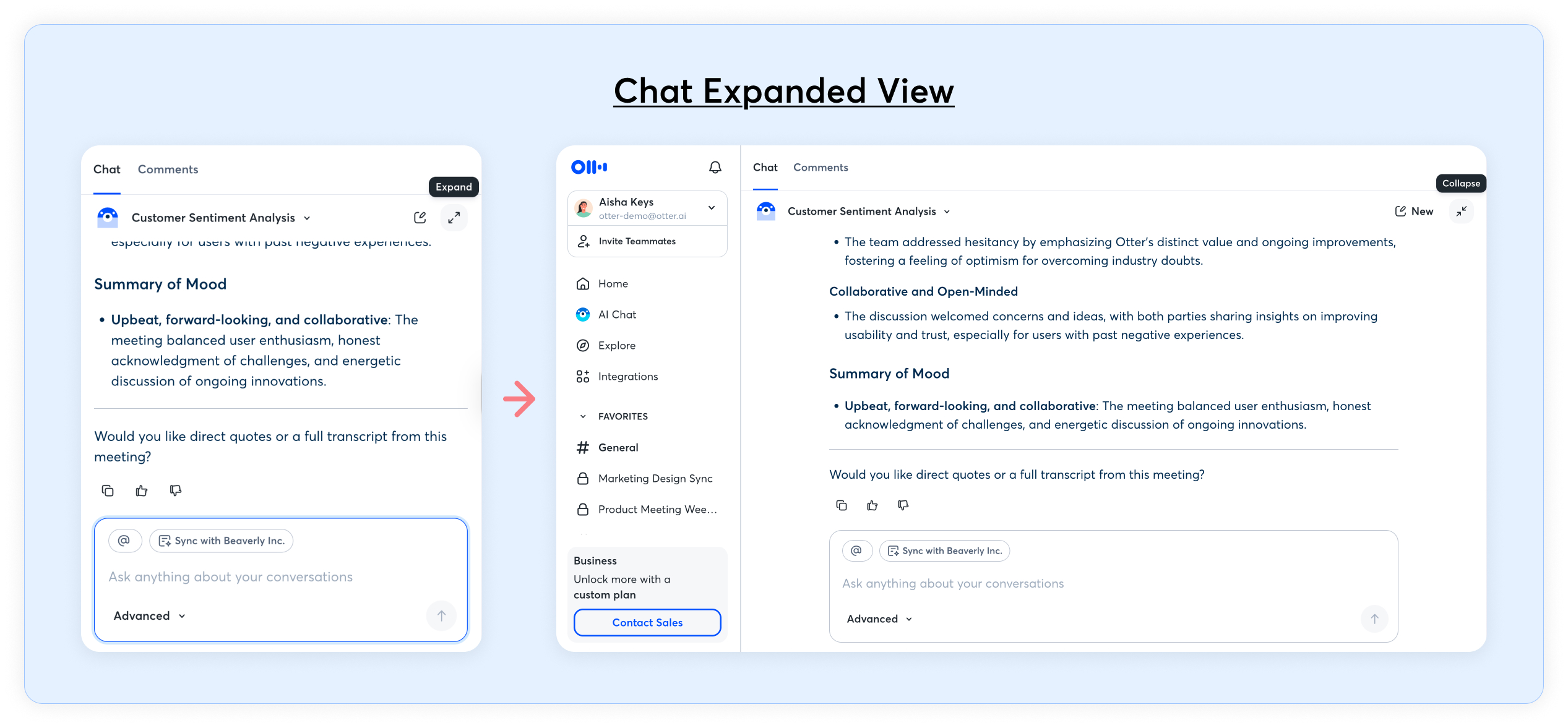 Interact with AI Chat seamlessly across all your conversations on the Homepage, in Conversation, or in Channel. Start in one conversation and end up in another anywhere within Otter. Ask questions and pull additional details anytime. Mention a conversation, channel, or folder to add context to your chat. You can use search to quickly filter and find what you’re looking for.