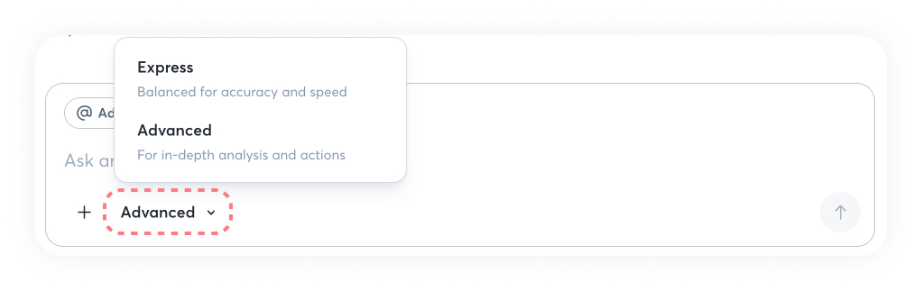 AI Chat offers two response modes — Express and Advanced — designed for different levels of reasoning, integration, and speed. Switch between modes as needed. Learn more about AI Chat modes.