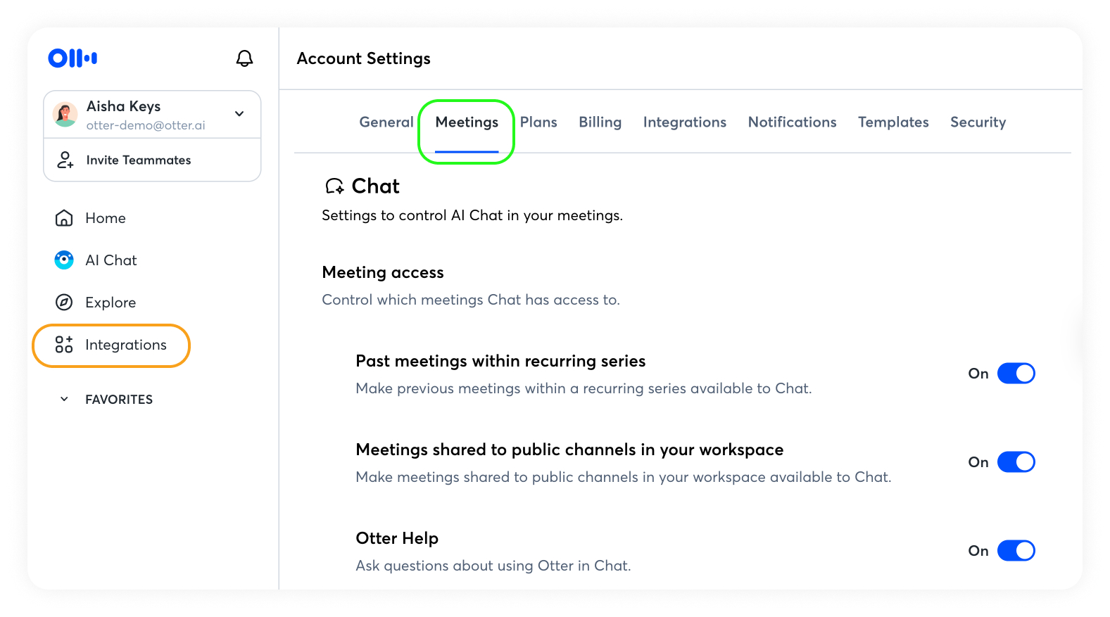 Go to Integrations > Meetings to manage all of your AI Chat settings for meetings. Control which meetings AI Chat can access.