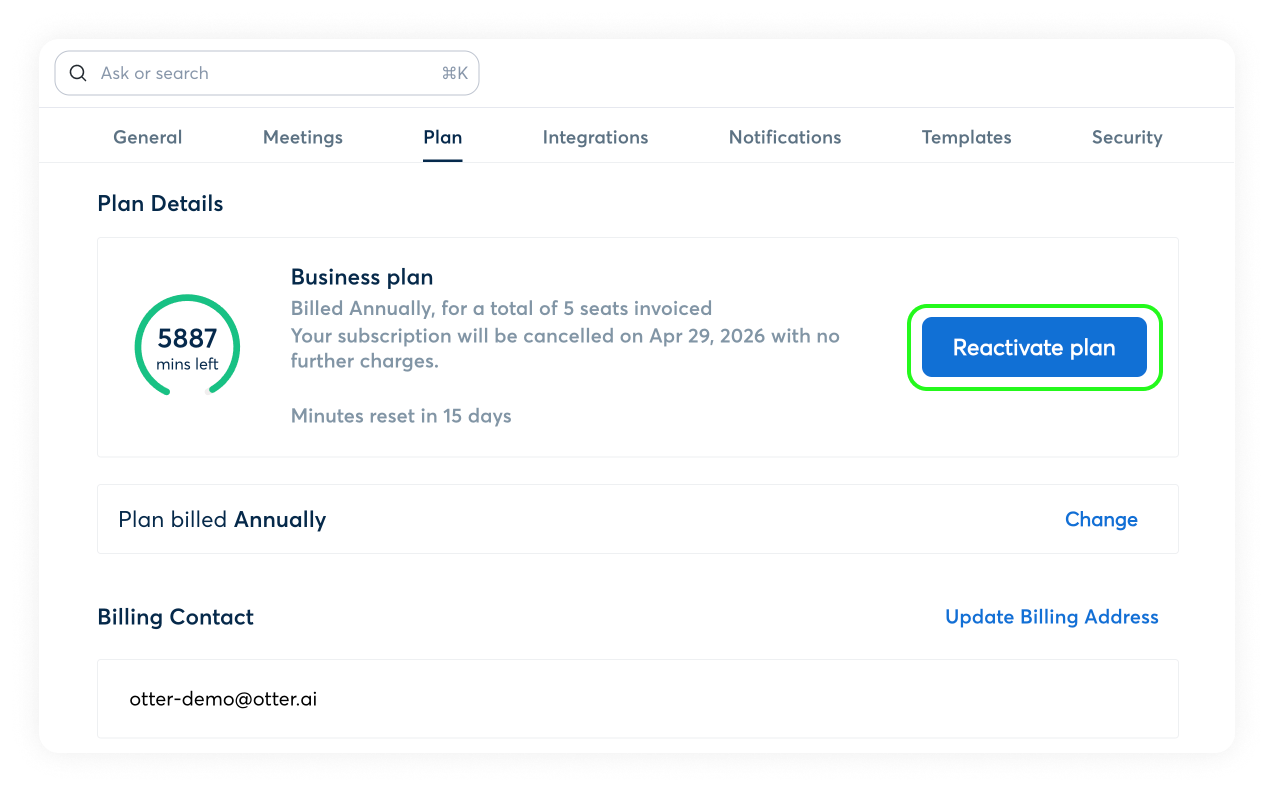 The owner or admin(s) can cancel an Otter subscription anytime to set the subscription to expire at the end of the billing period. Once the paid subscription expires, the Workspace can continue to use Otter on the Basic plan.