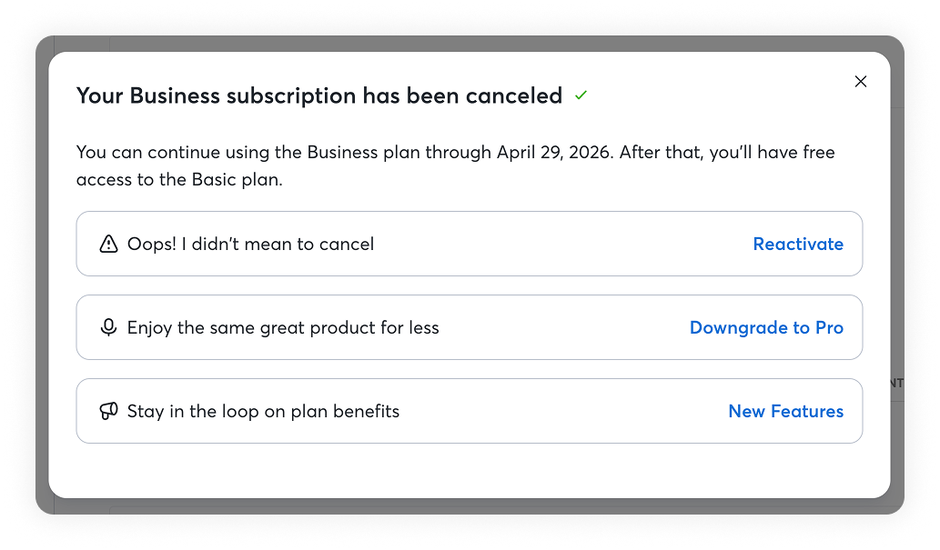 Tip: Don't want to fully cancel your subscription, but need a break? Try using the Pause Plan option instead. -