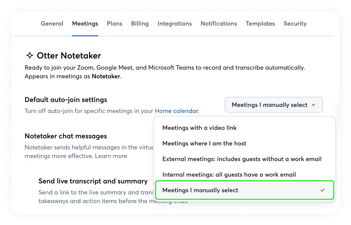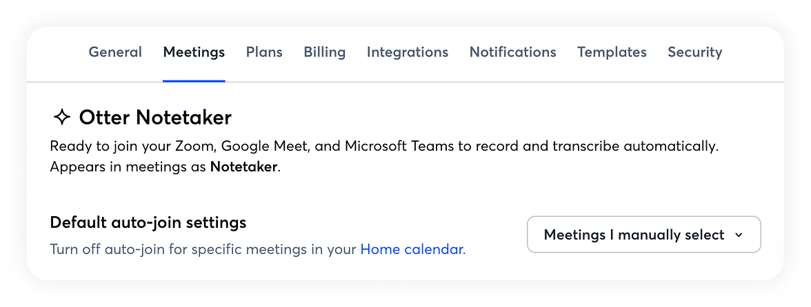 Note: To ensure Otter Notetaker automatically joins a meeting, update the auto-join setting at least 30 minutes before the event start time. Changes made less than 30 minutes in advance may prevent Notetaker from joining successfully or on time.