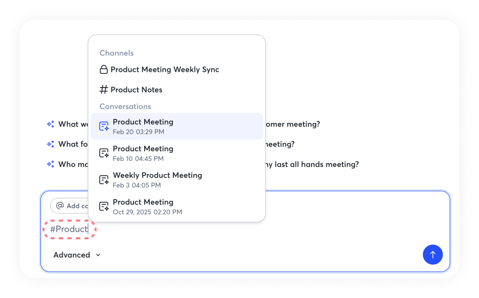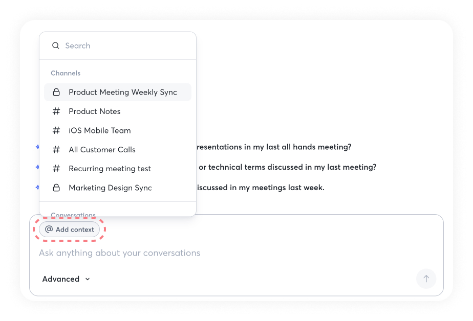 Click @ Add context to add conversations, channels, or folders to your queries.