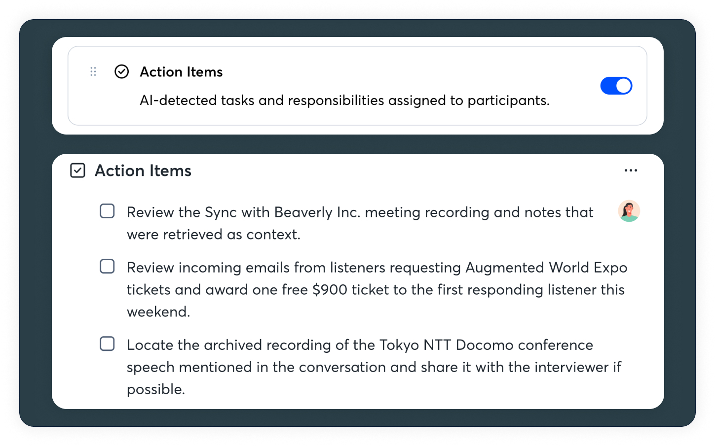 AI-generated action items that capture tasks and responsibilities from the meeting. Toggle on or off to show or hide this section in the Summary tab. Otter automatically assigns action items, and you can add more manually at any time.