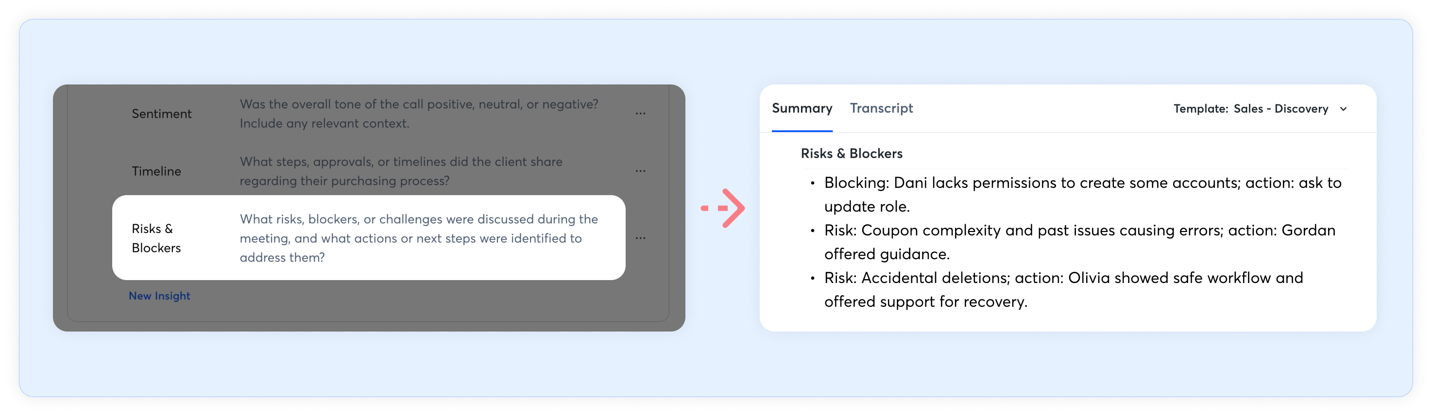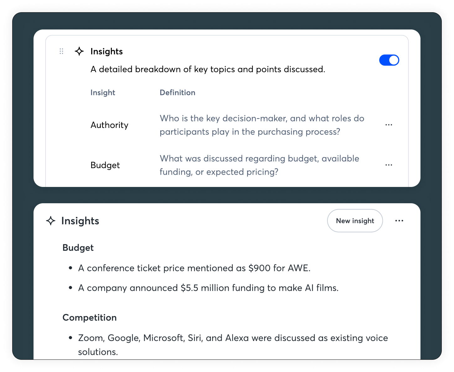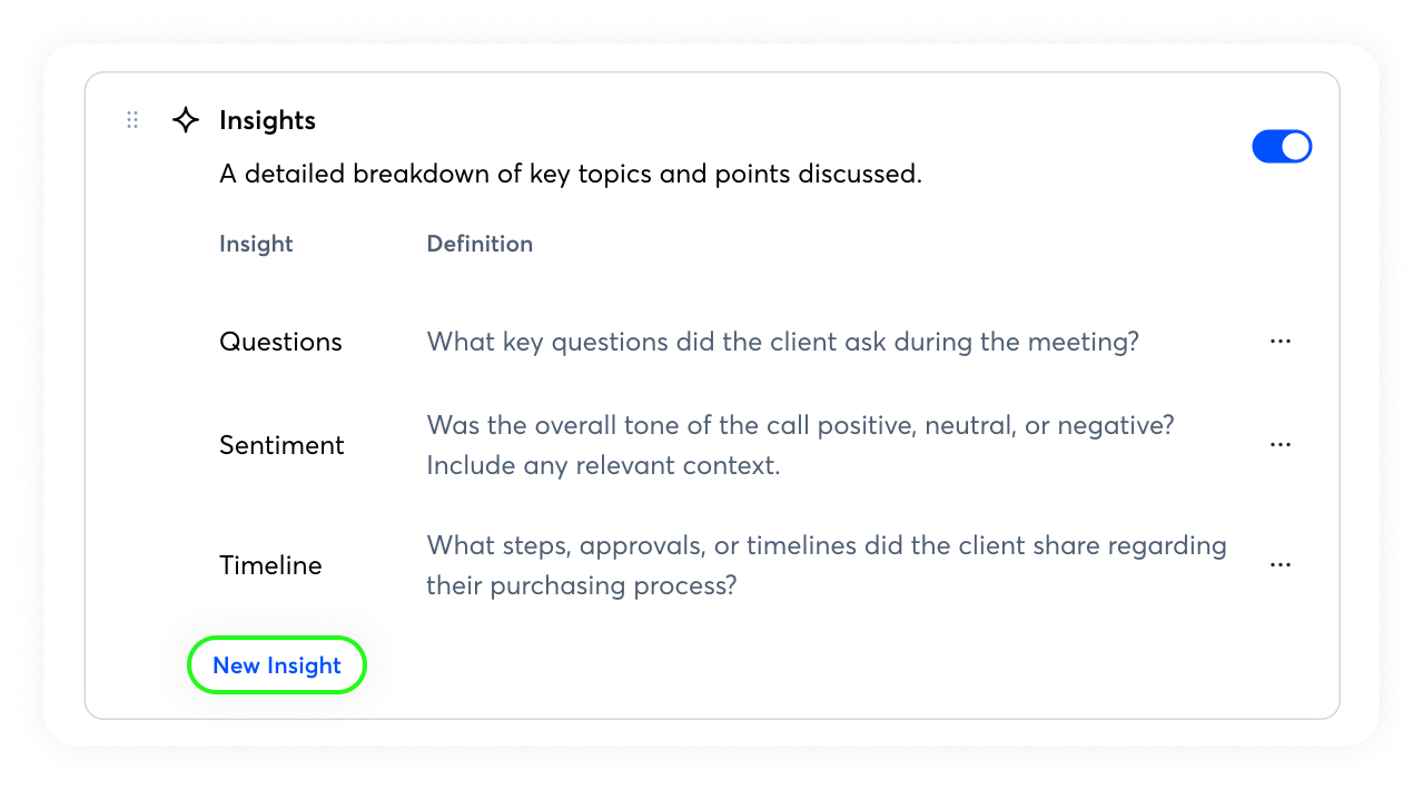 A detailed breakdown of key meeting topics and discussion points. Insights summarize meeting conversations into actionable takeaways, organize important information into categories, and highlight key points up front, typically as short topics with supporting bullet points. Toggle this section on or off to control its visibility in the Summary tab when the template is applied.