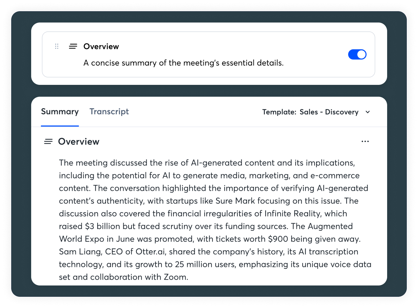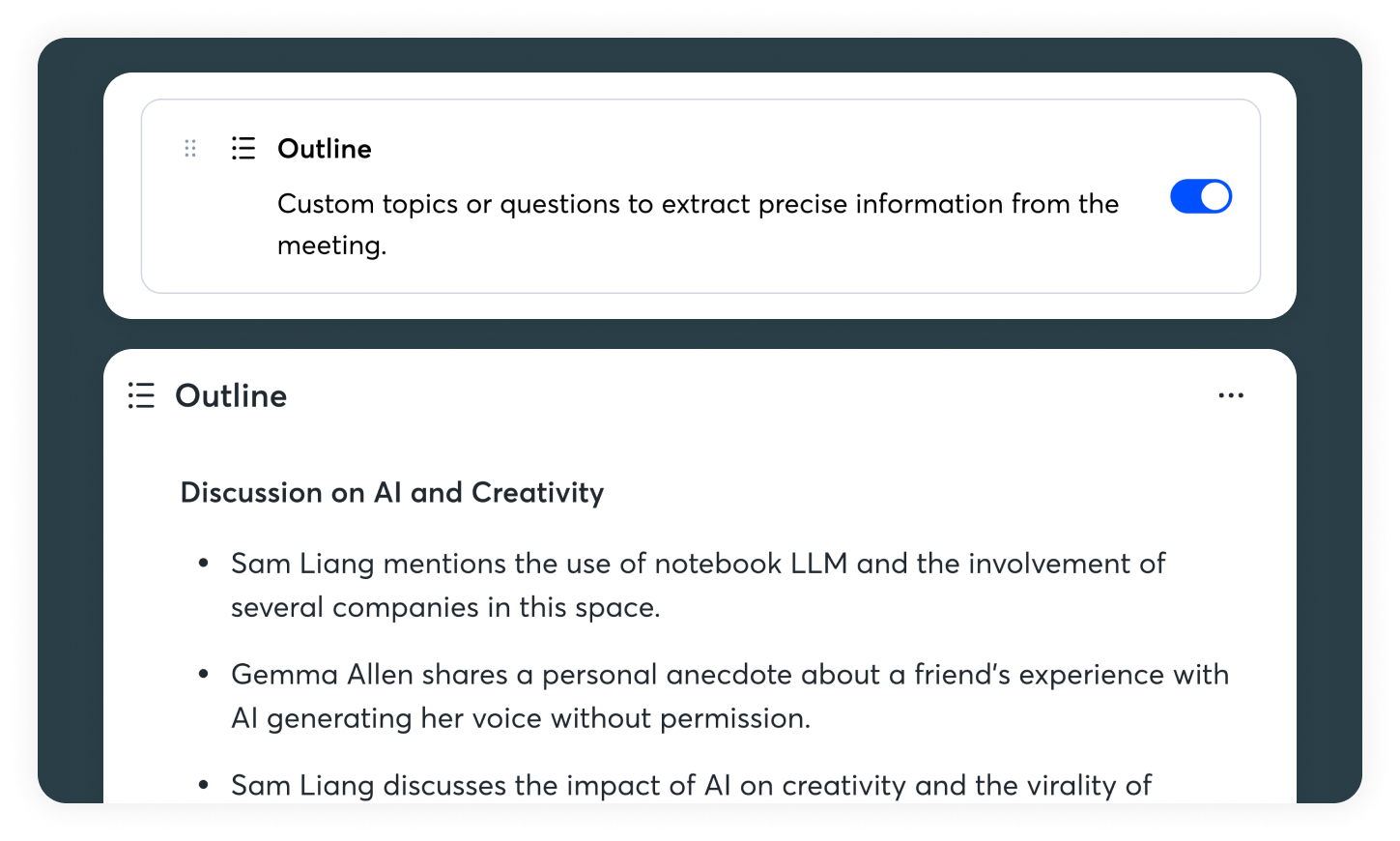 Automatically generated structured summary and a high-level overview of your meeting. Toggle ON or OFF to display or hide this section on the conversation’s Summary tab when applying the template. Click on any part of the Outline to go directly to the associated source in the transcript.