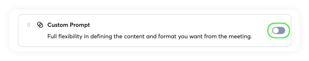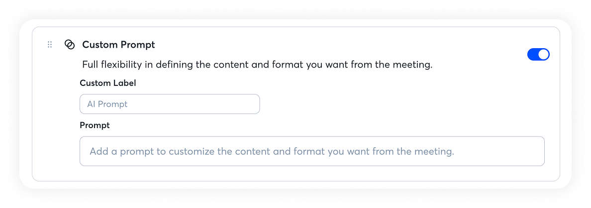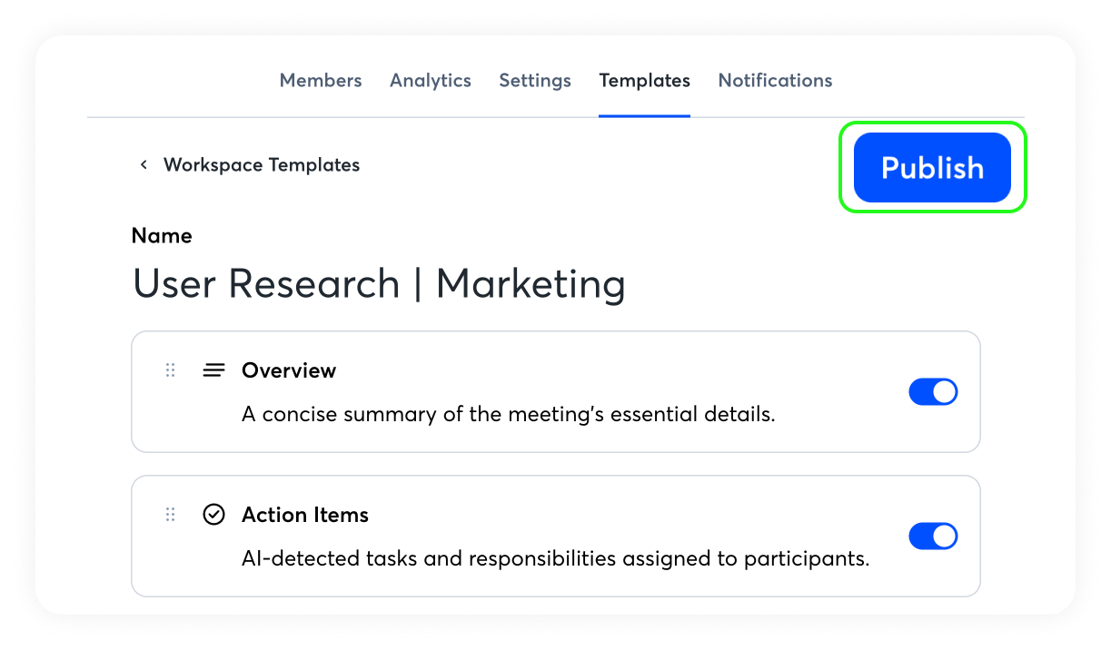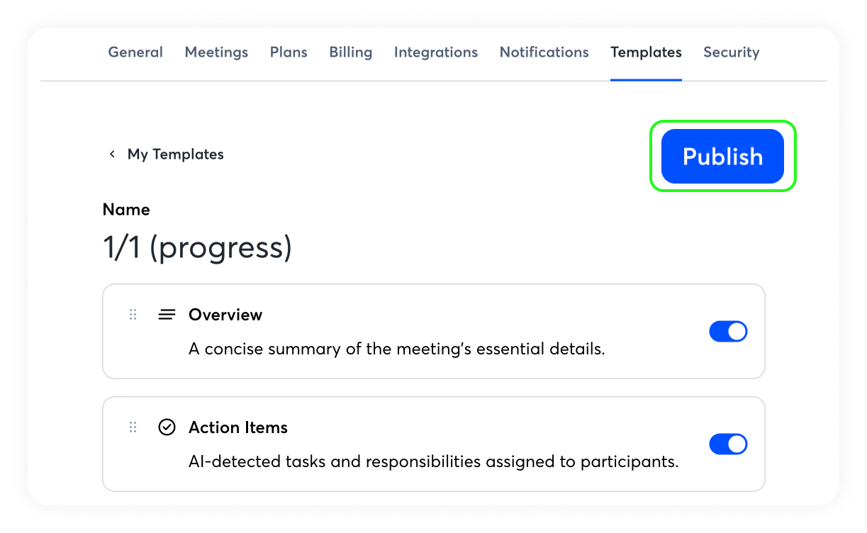 A concise summary of the meeting’s key details. Toggle this section on or off to show or hide it in the Summary tab when the template is applied.