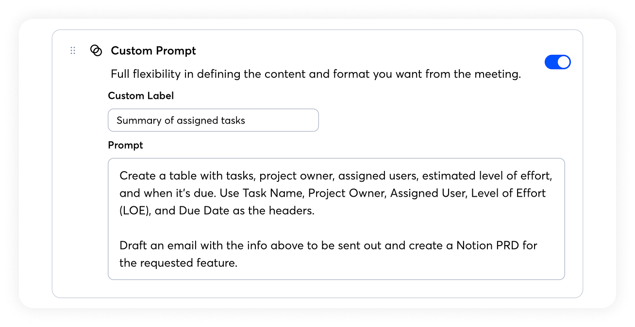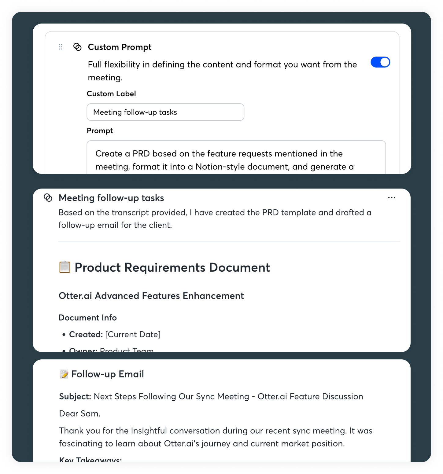 Full flexibility in defining the content and format you want from the meeting. Generate all types of content for post-meeting processes, such as sending an email of the meeting, translating the transcript to another language, creating the next meeting’s agenda, and much more. The possibilities are endless. Otter supports Markdown, so you can format your prompt and ensure the output reflects exactly what you need.