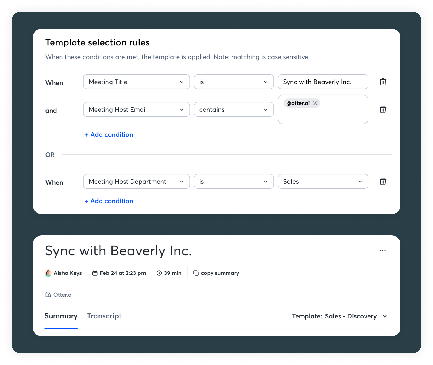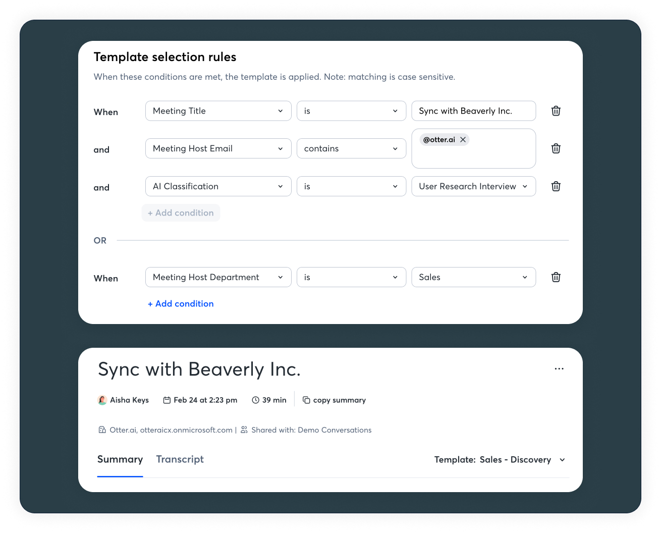 Set rules to automatically apply the template to meetings that match the conditions. Set one or multiple conditions to match various meetings.