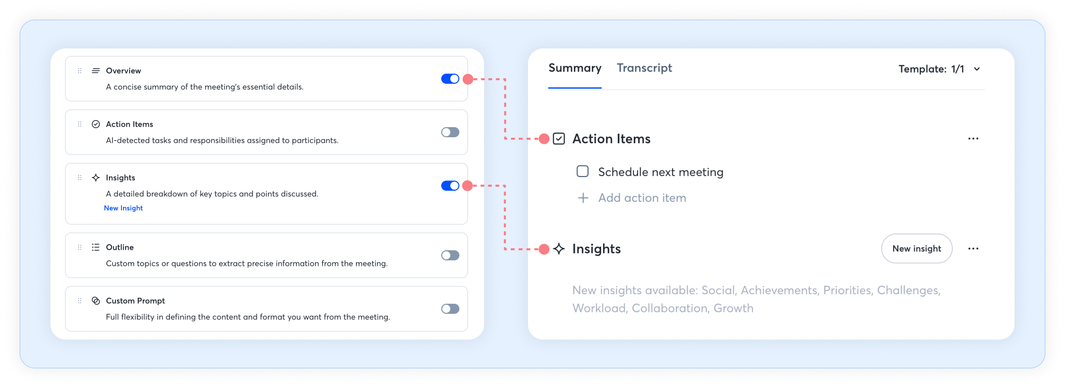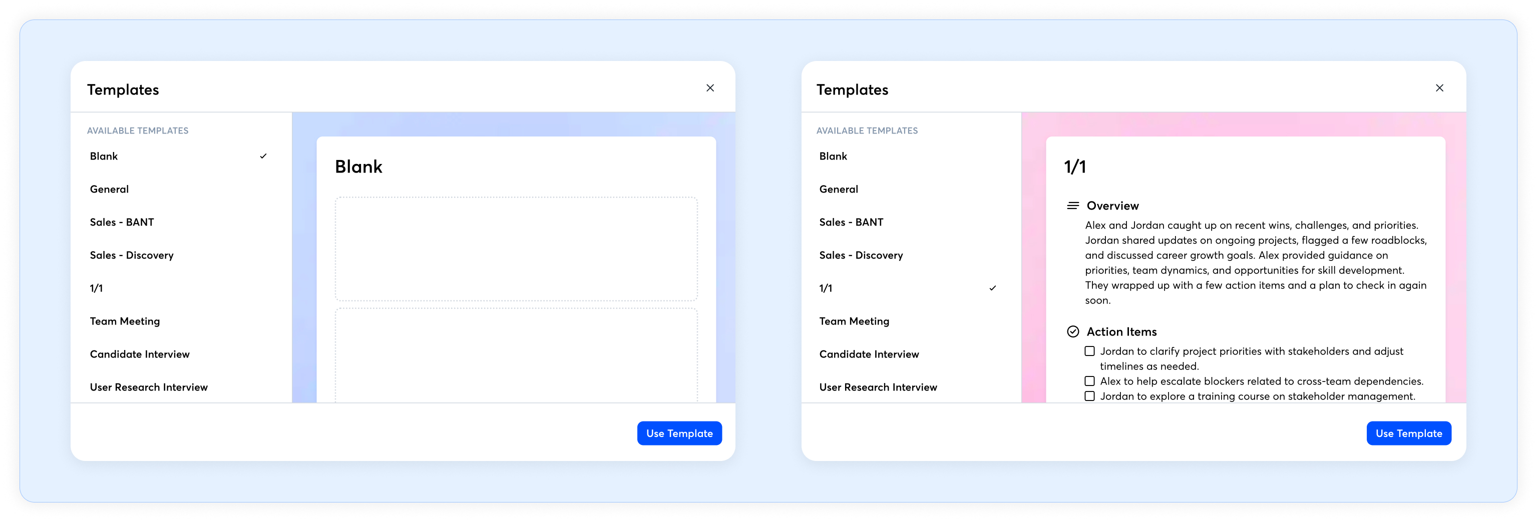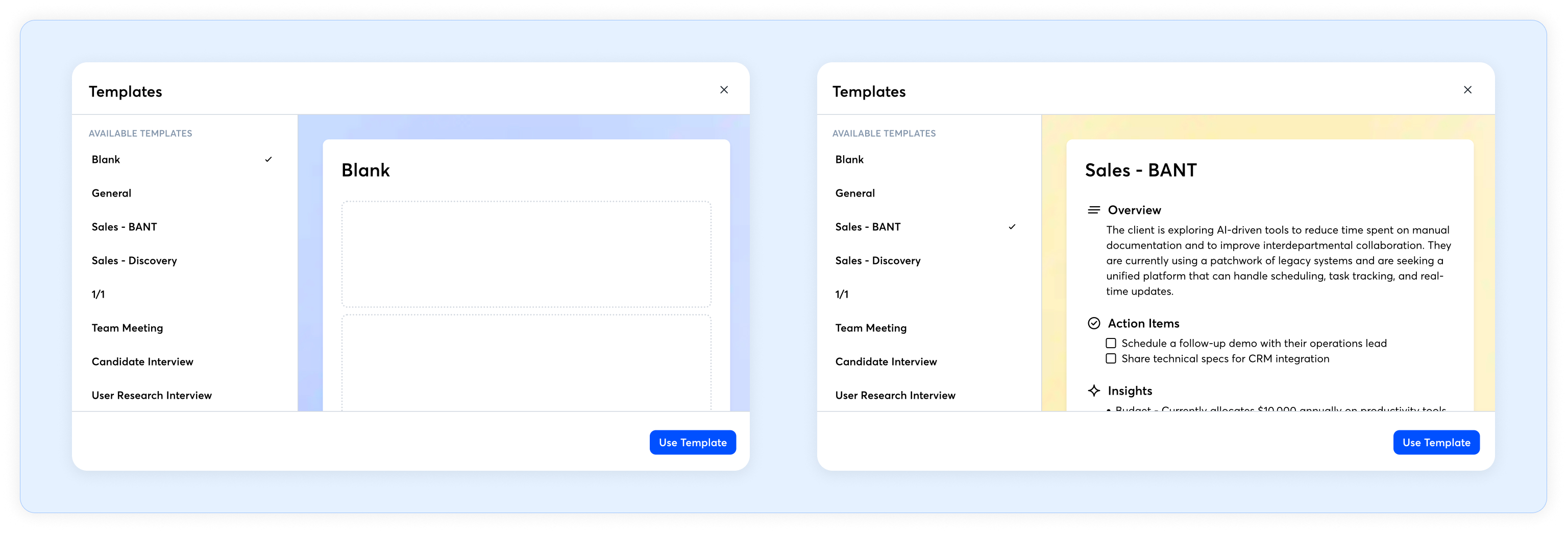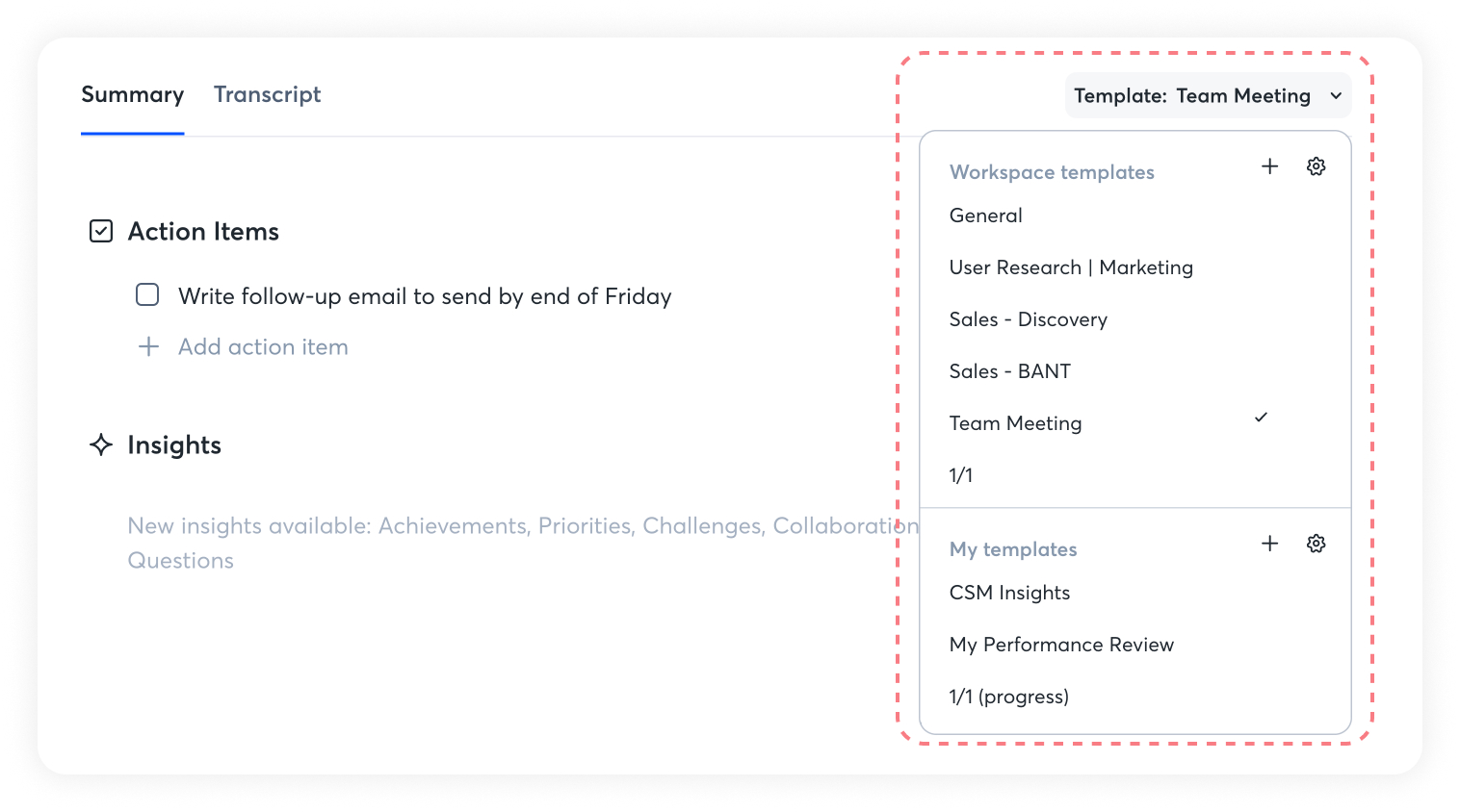 Easily apply a template to automatically generate key details, insights, and structured summaries from your conversations. Meeting templates help streamline repeat workflows, especially for conversations where you consistently follow the same format or process.