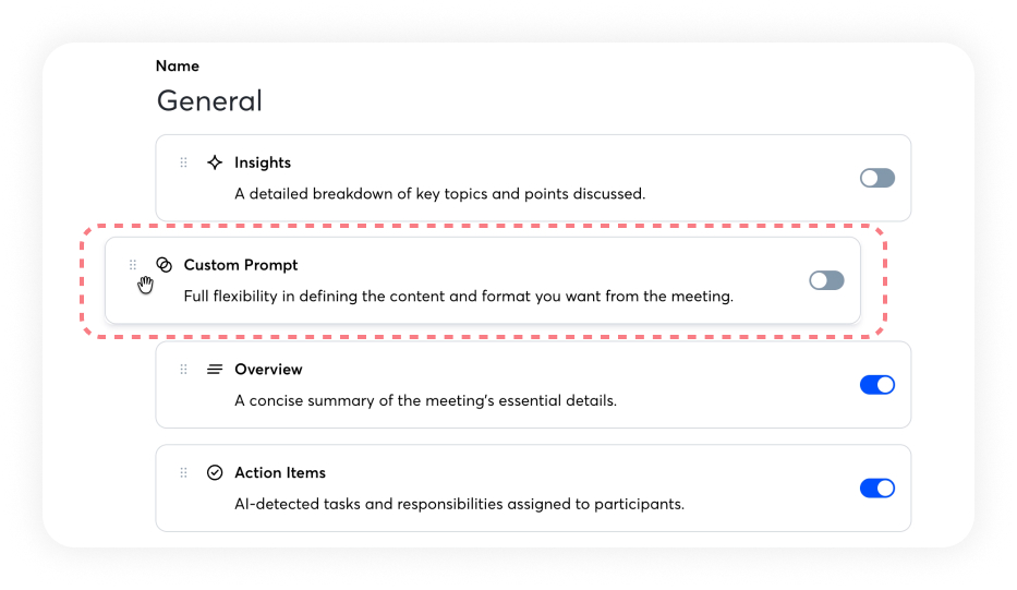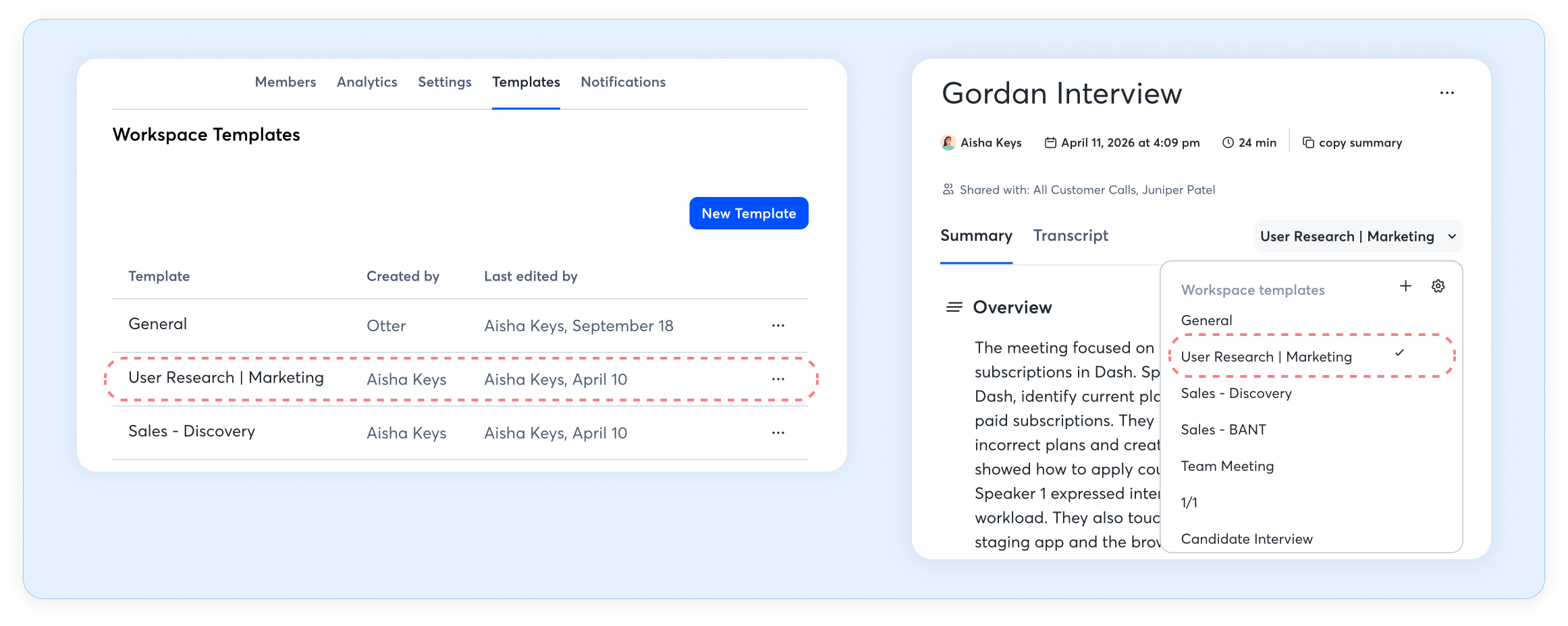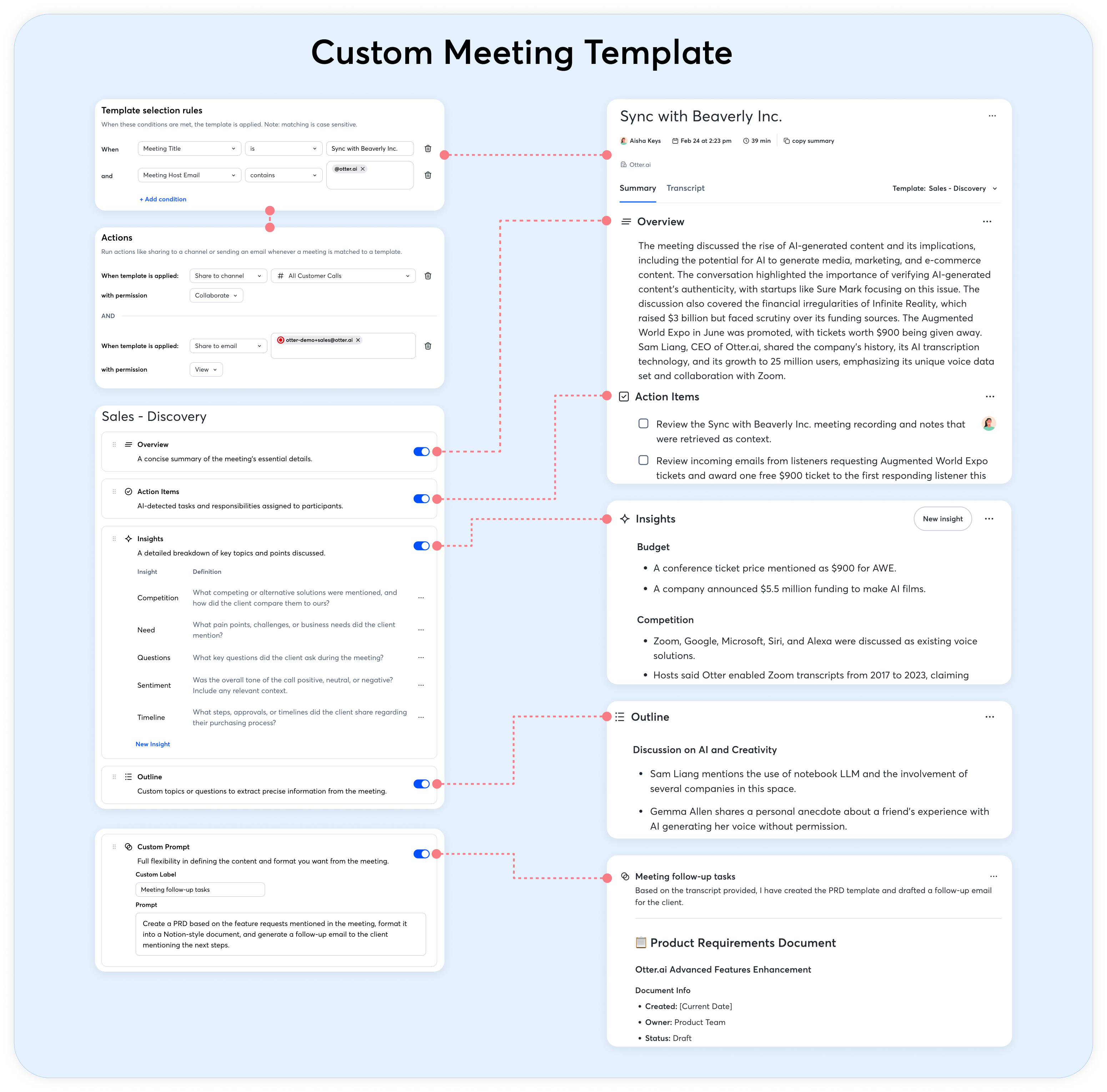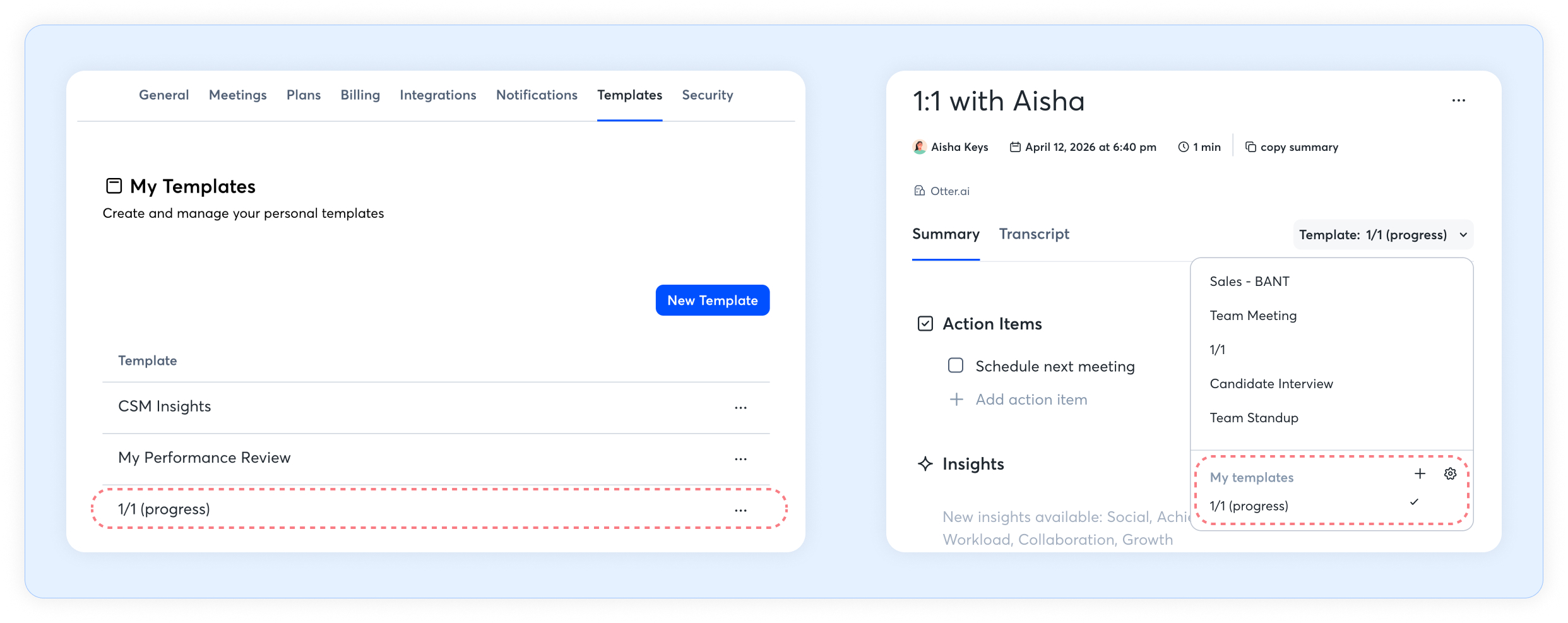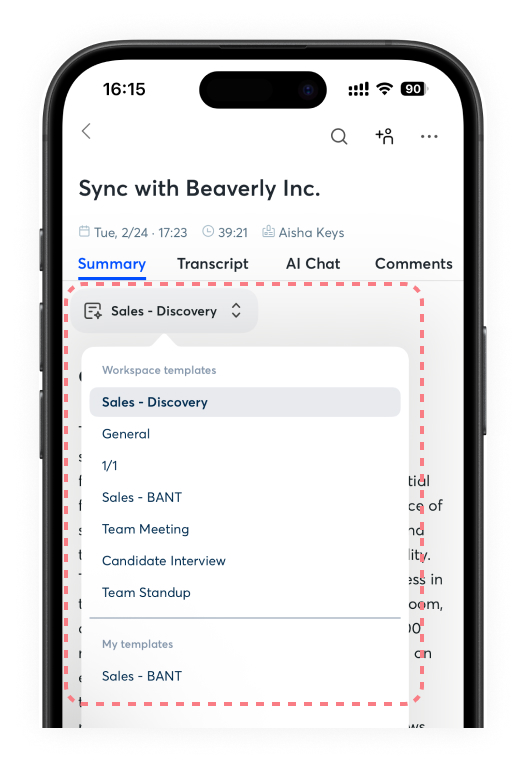 Easily apply a template to automatically generate key details, insights, and structured summaries from your conversations. Meeting templates help streamline repeat workflows, especially for conversations where you consistently follow the same format or process.