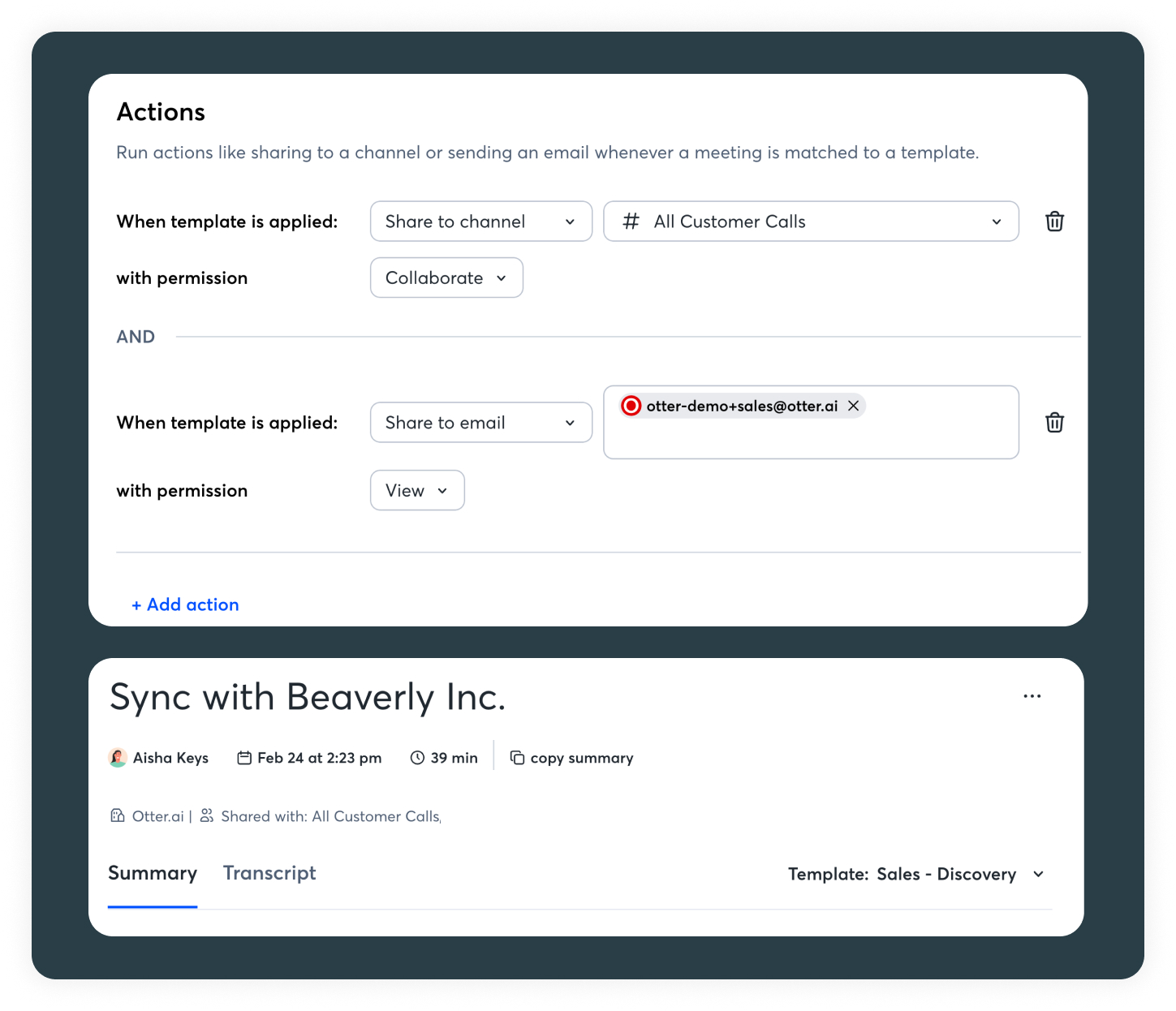 Run actions like sharing to a channel or sending an email whenever a meeting is matched to a template.