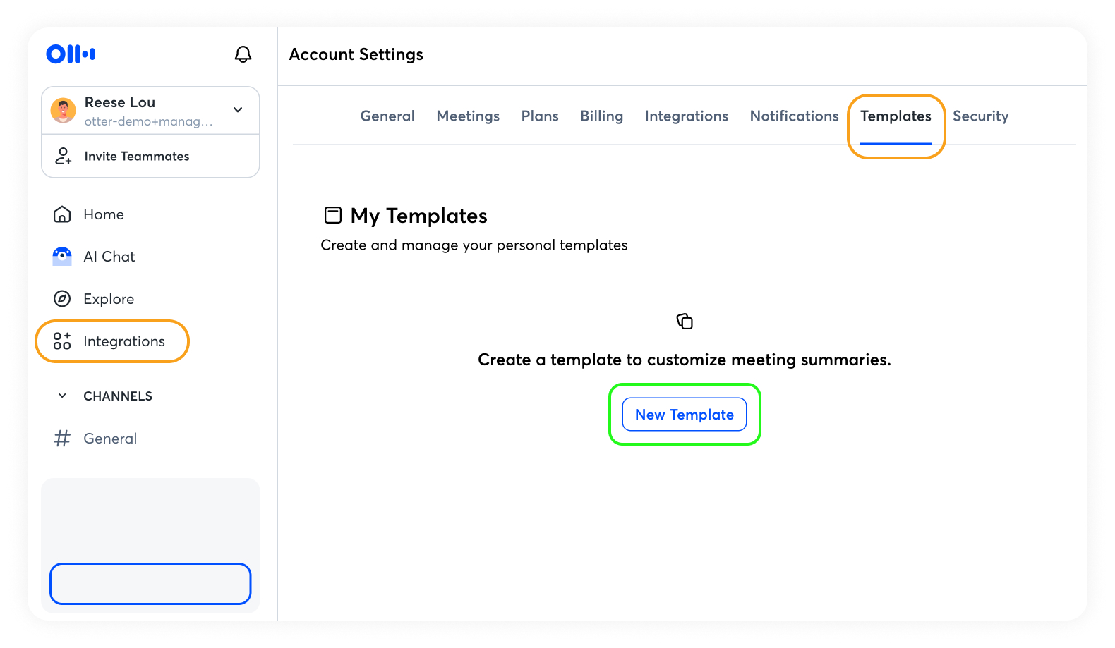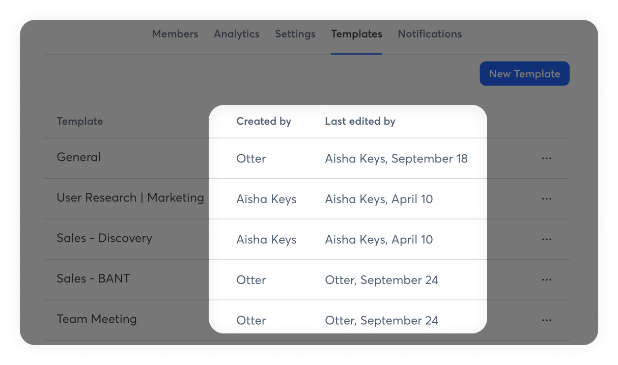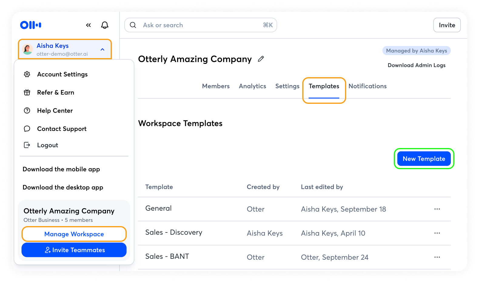 You must be an admin to create a template for the workspace. By default, all workspaces will include preset templates from Otter.