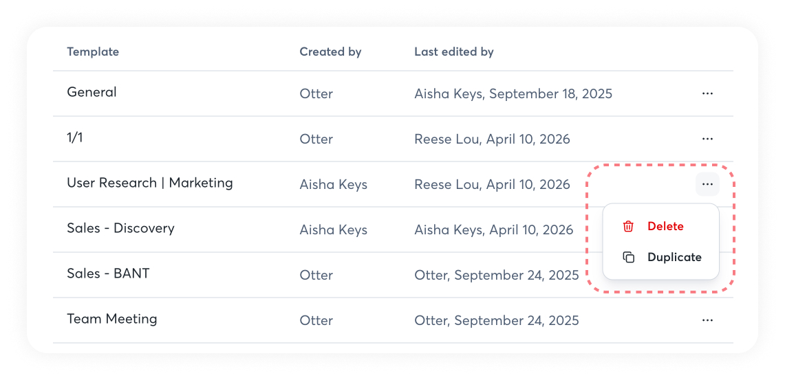 Click the three dots (⋯) next to the template, then select Duplicate or Delete.
