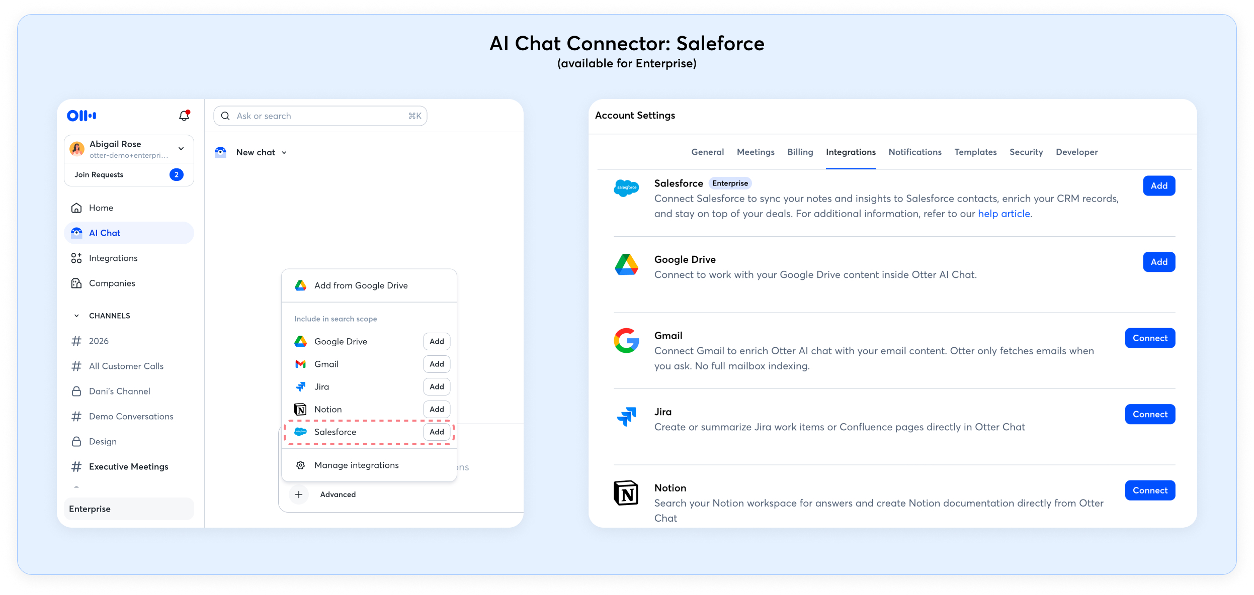 Salesforce enriched Otter Chat: Get quick answers based on your Salesforce data using Otter Chat.