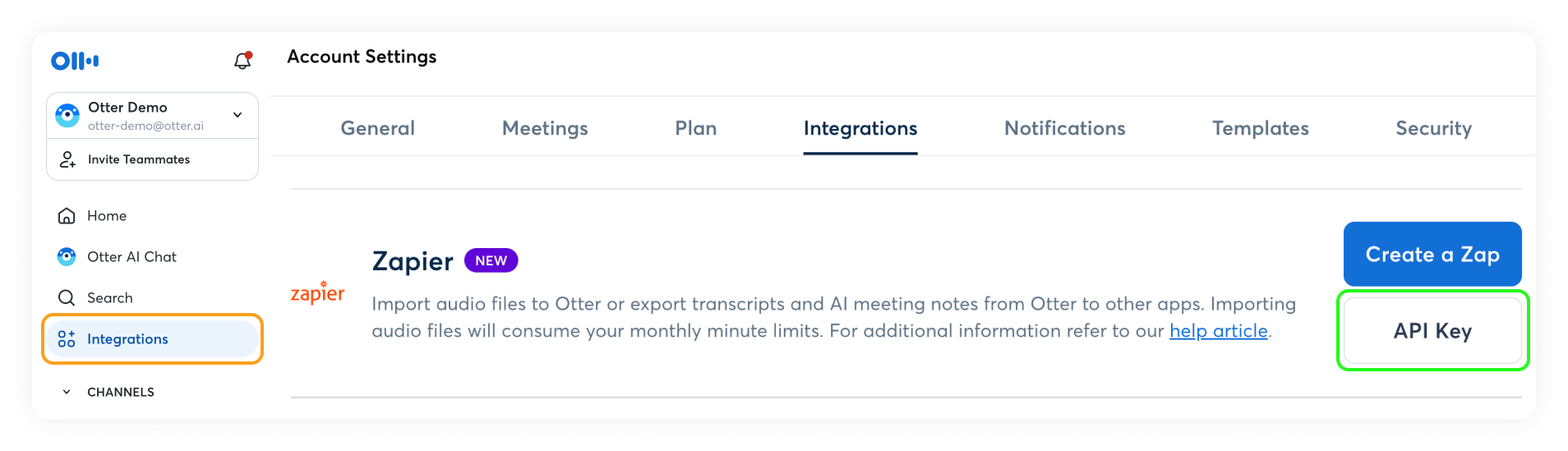 - Next, create the API key in Otter. Sign in to Otter. Click Integrations in the left navigation menu. Click API Key next to Zapier to generate the key.