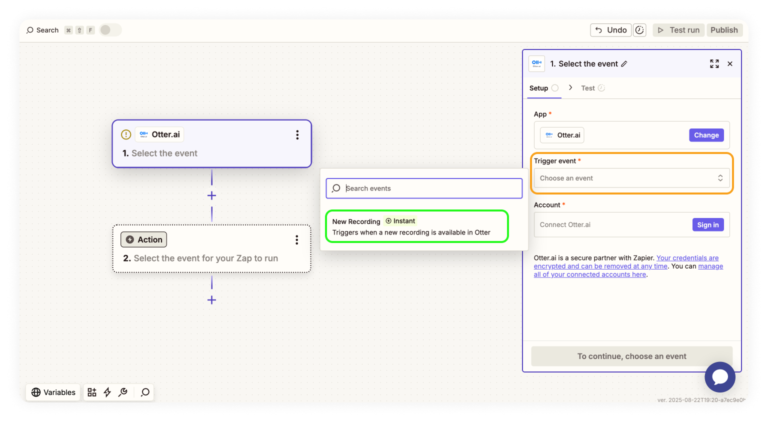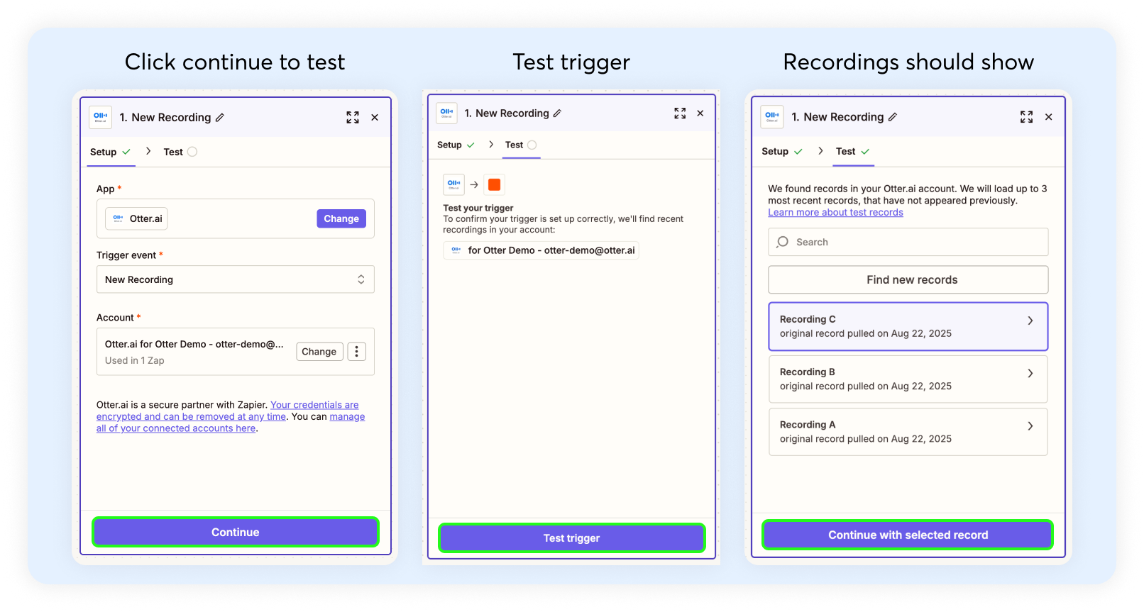 Once connected, click Continue on the setup card. Click Test trigger. The most recent recordings from your Otter account should show. Click Continue with selected record to proceed if everything looks correct.