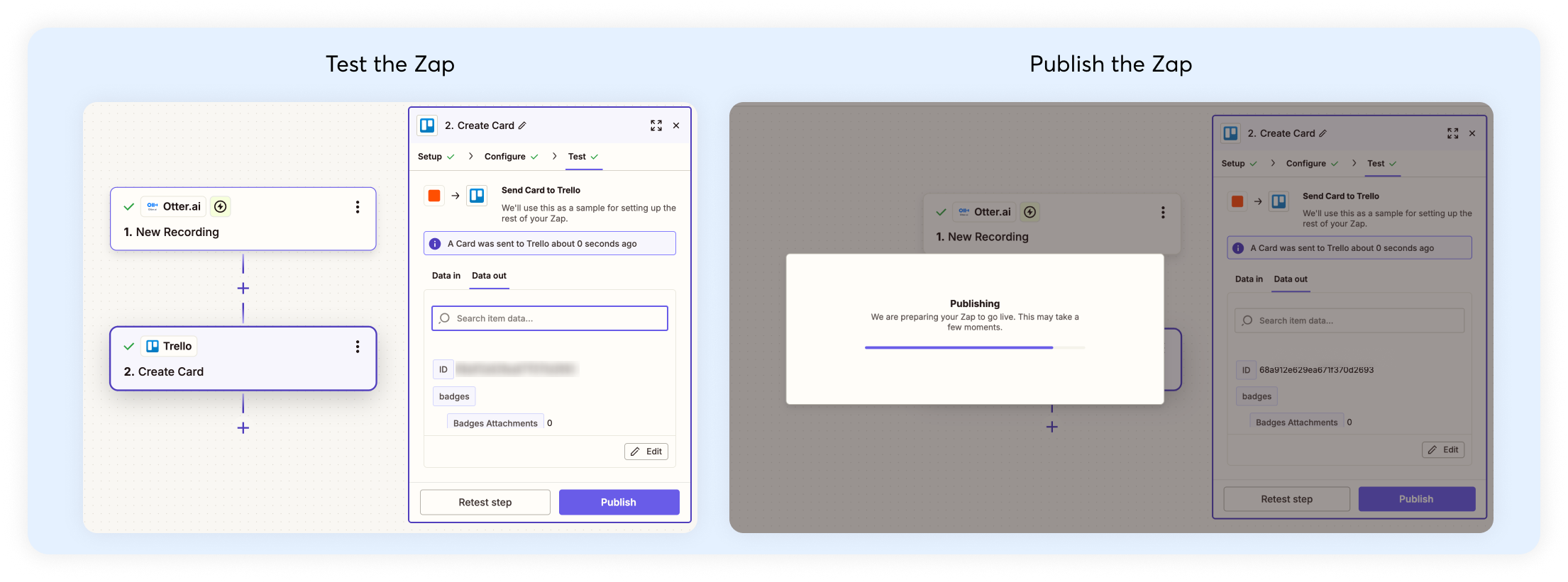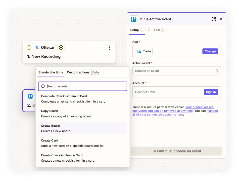 Connect Otter.ai to Trello using Zapier. This guide will go over a general setup of creating a Zap between Otter and Trello; however, there are a variety of workflows and setups you can create. This guide outlines some of the available options, but it is not exhaustive. Learn more about Otter's integration with Zapier.