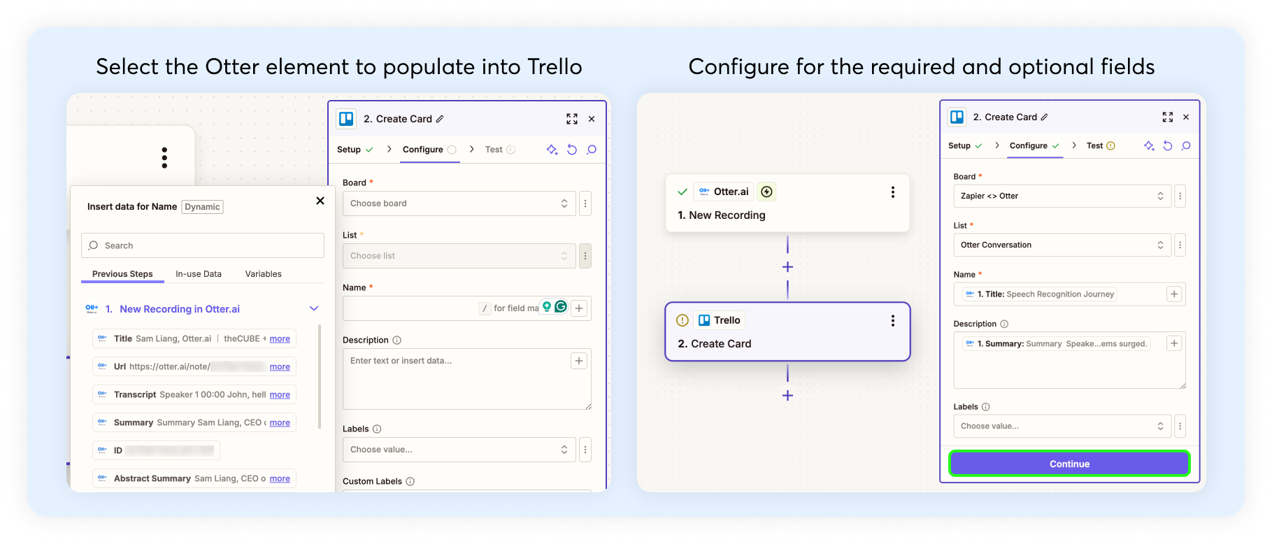 On the configure page, there are a variety of Otter elements you can select to populate into Trello. Fill out all the required and optional fields. Click Continue to proceed.