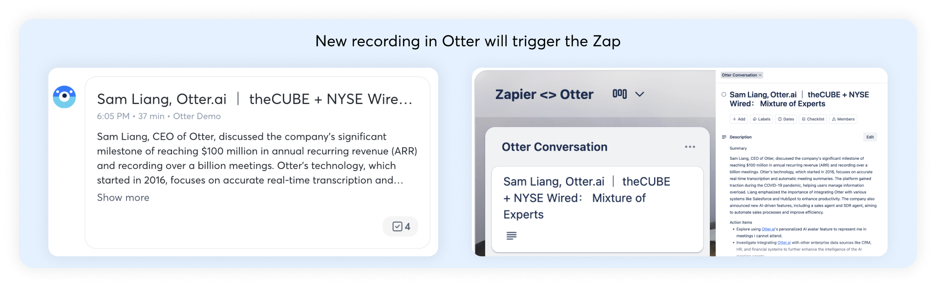 (e.g., every time there is a new Otter recording, a new board is populated in Trello with the Title and Summary of the Otter conversation)