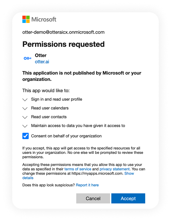 If you’re experiencing calendar permission issues, such as being unable to accept permissions or needing admin approval, contact your Microsoft admin. We recommend having your admin grant the required calendar permissions to ensure a seamless connection to Otter.