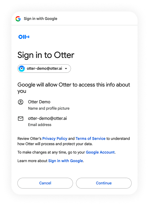 Review the permissions and click Continue to connect your Google account to Otter.