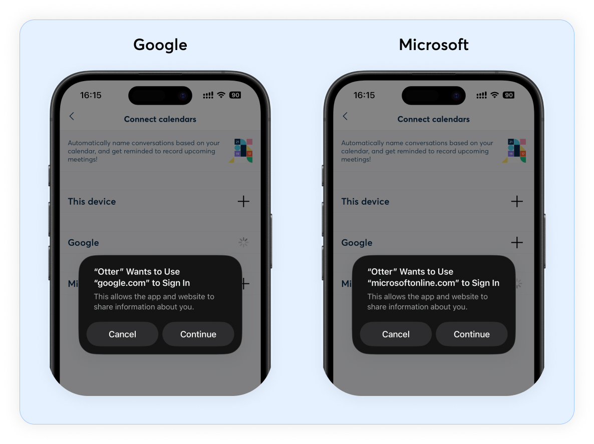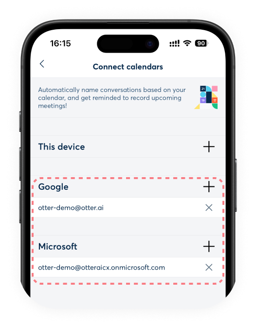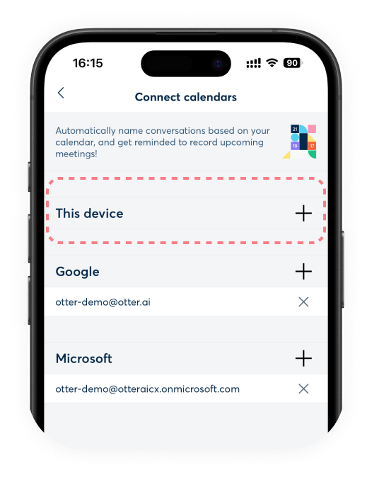 iOS users can connect their Apple Calendar to Otter. Tap the plus button (+) next to This device, follow the steps, and select the calendars you want to sync to Otter.