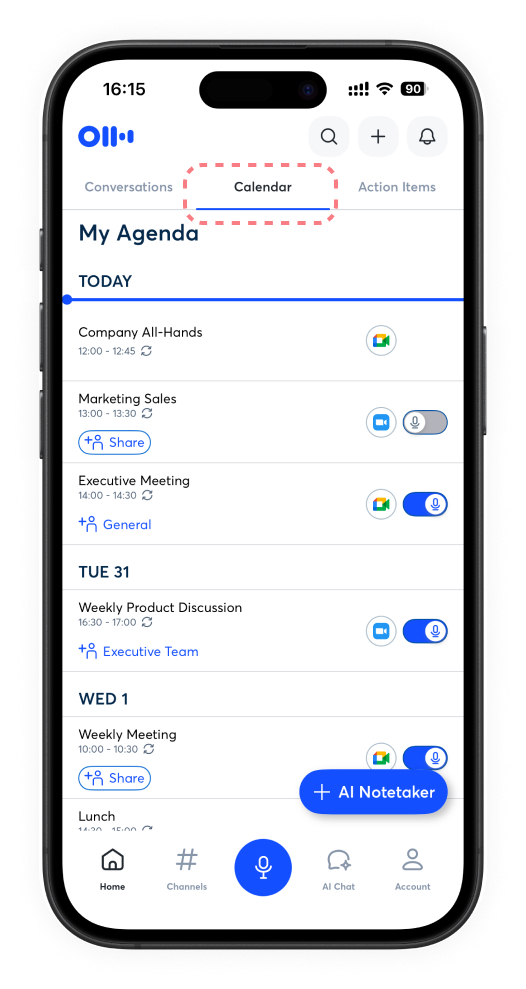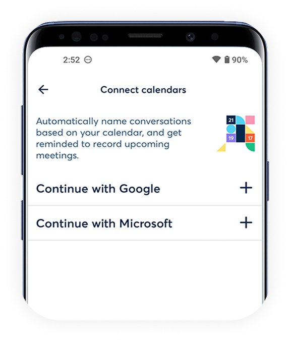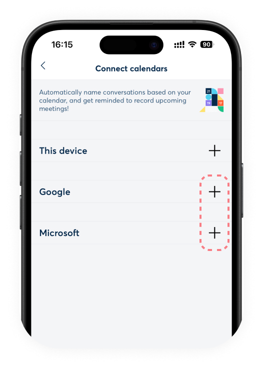 Connect your Google, Microsoft Outlook, or iOS Calendar account in the mobile app.