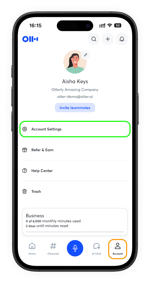 Tap Account in the lower-right corner, then select Account Settings.