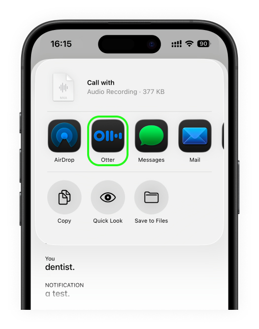 - Once the phone call recording has ended, navigate to the file. Share the file. Select Otter from the share menu.