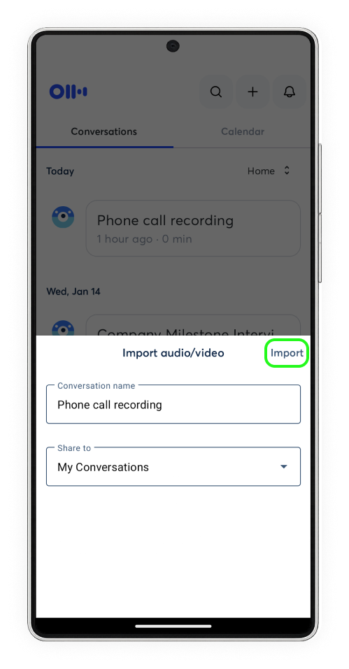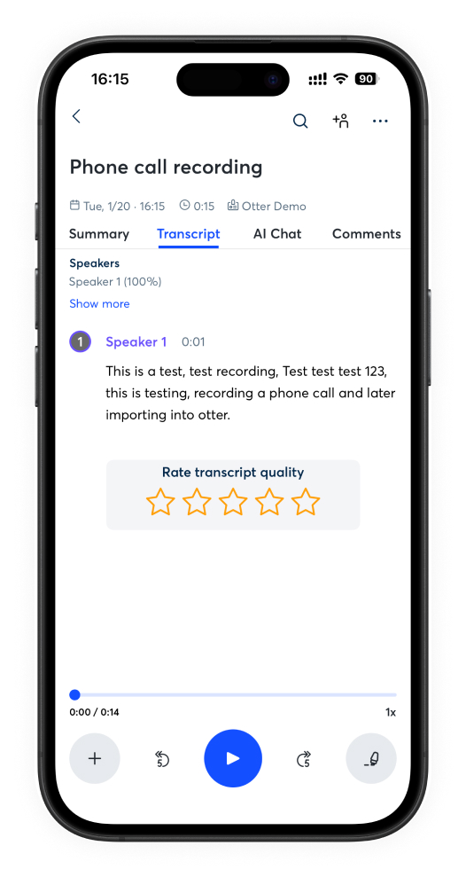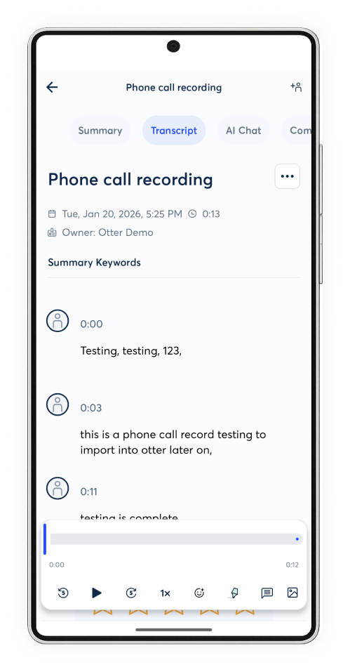 Import your phone call recordings into Otter to transcribe conversations, generate smart summaries, apply speaker tagging, and unlock additional insights. Apple and Google currently restrict third-party apps from recording phone calls directly, so calls must be recorded separately and imported into Otter. We hope to offer direct phone call recording and transcription in the future if platform policies allow.