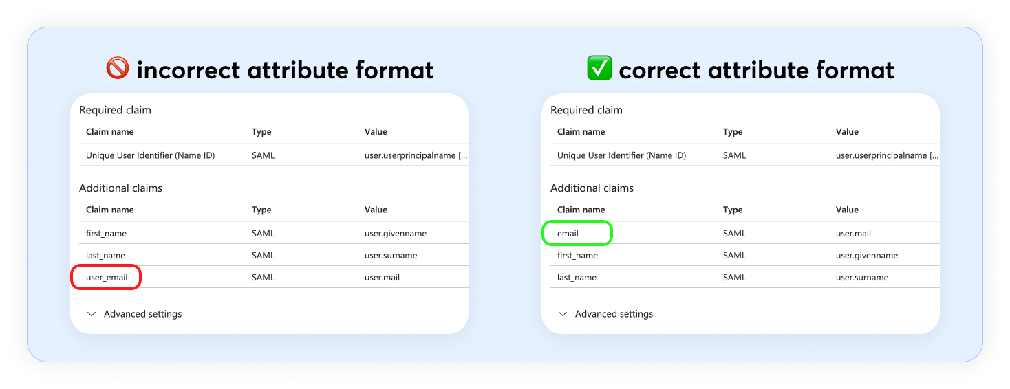 - ✅ To resolve this issue, update the claim name to email.