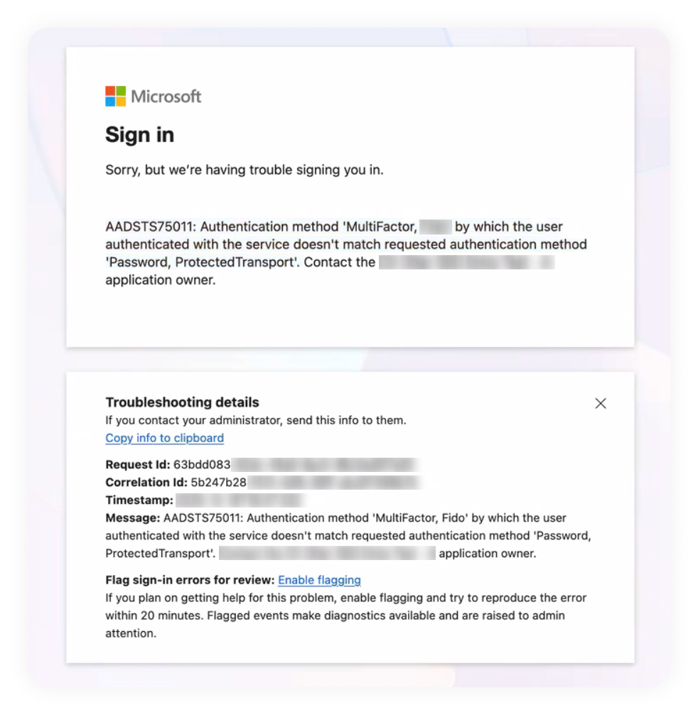 One way to sign in to Otter is by selecting Continue with Microsoft. If you or a member of your workspace encounters the AADSTS75011 error, it means Microsoft Entra ID rejected the sign-in request due to an authentication policy or requirement that was incompatible with the request. To resolve this issue, contact our Otter Support team and provide a screenshot similar to the one below.
