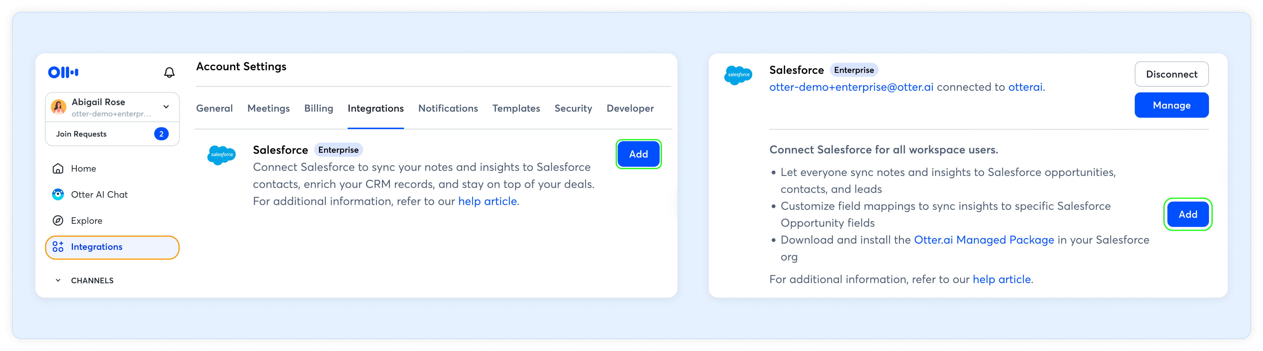 Admins can add Salesforce in Integrations > Salesforce > Add. Ensure you connect Salesforce for all workspace users.