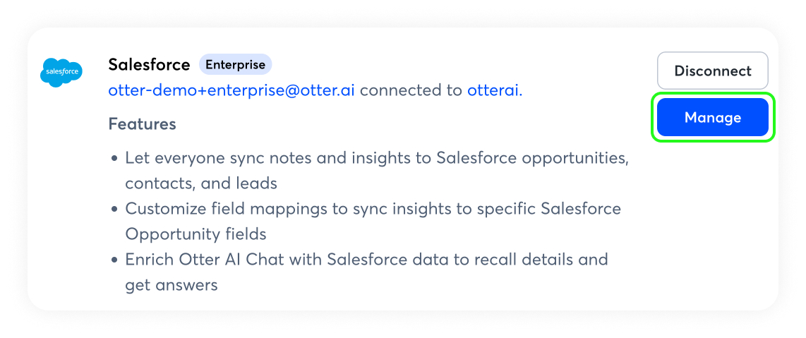 Otter admins can map specific Otter Insights to fields on the Salesforce Opportunity object. This option becomes available after the Salesforce integration is authenticated, and you select Manage. Learn more about managing and customizing Salesforce Insights.