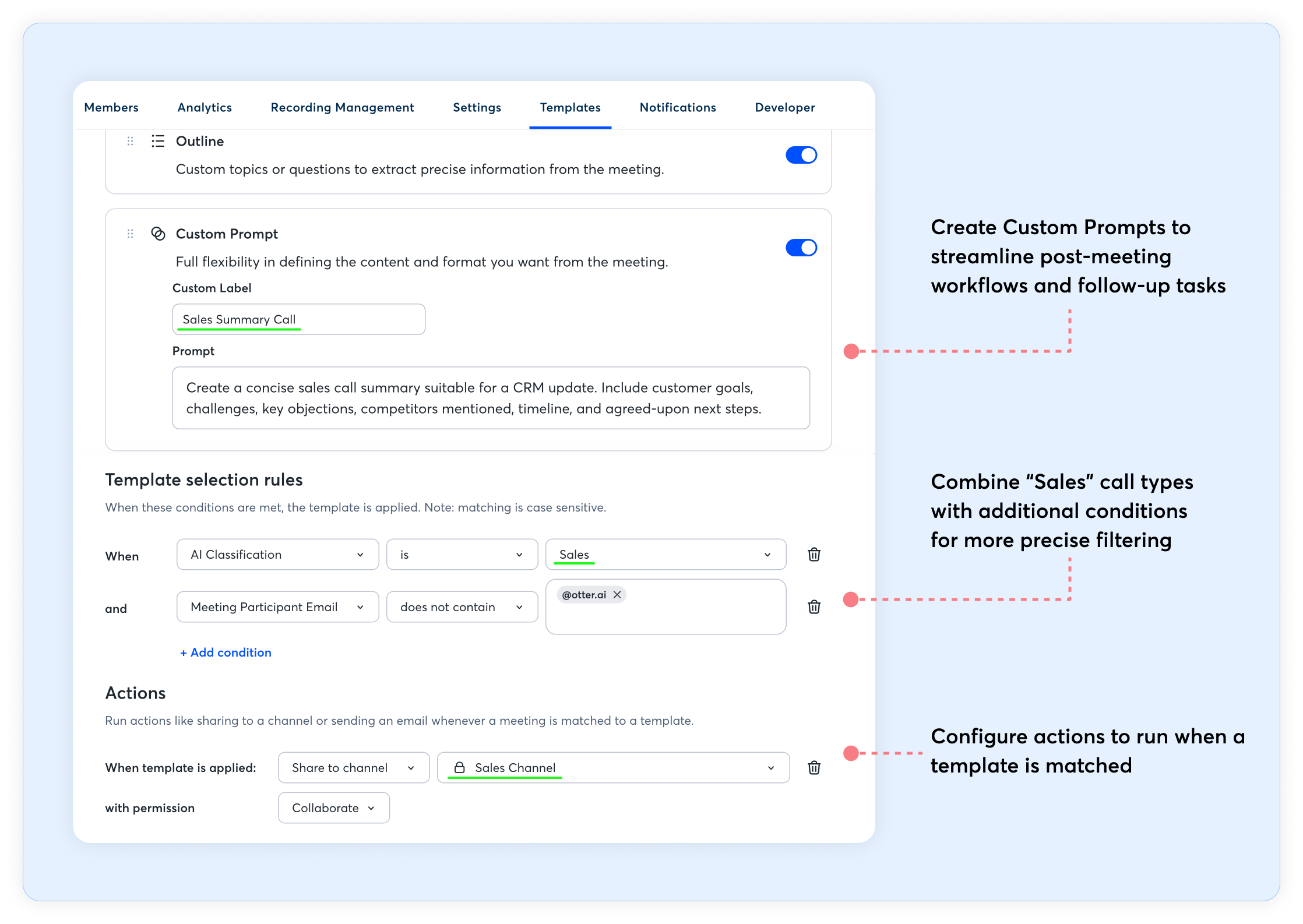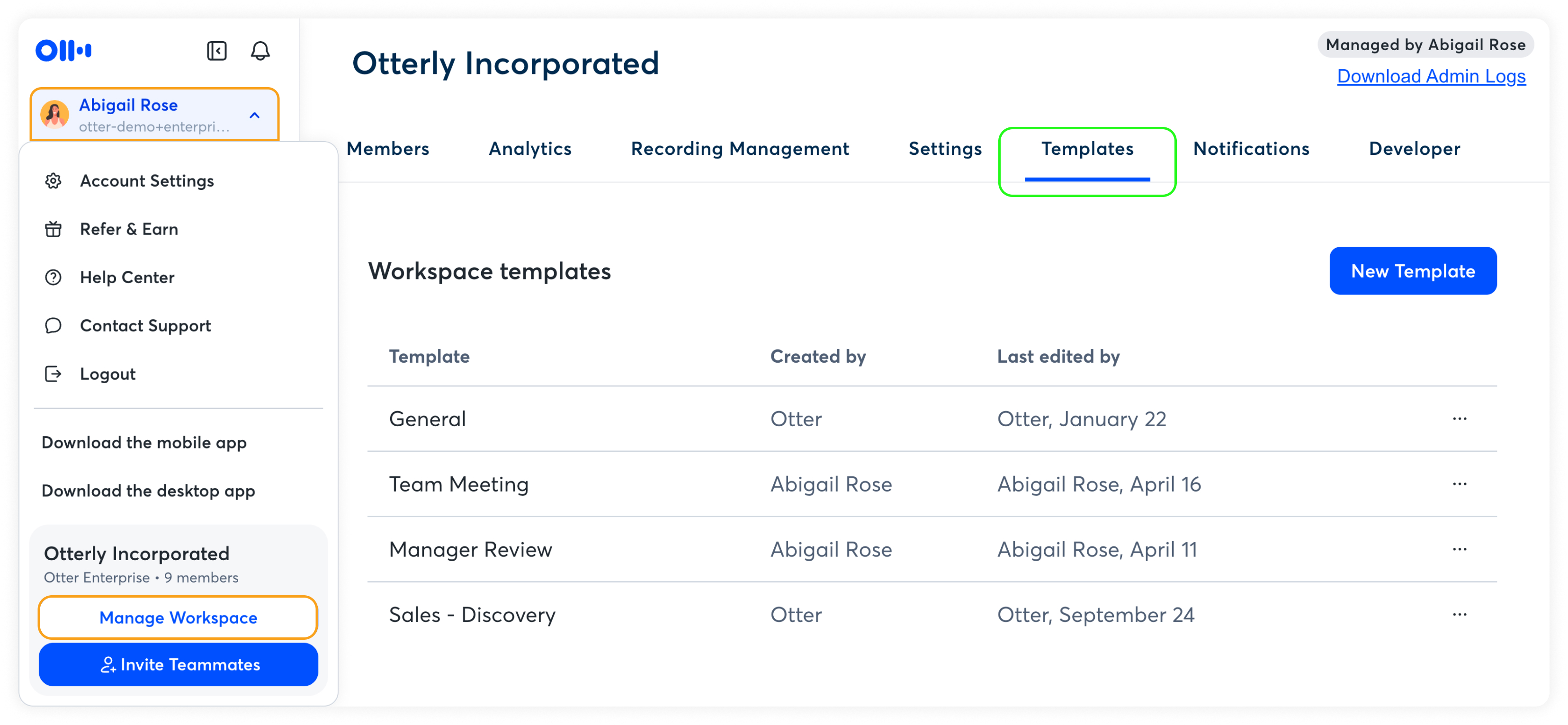- Workspace-level meeting templates can be created by Otter admins for all users to use in Manage Workspace > Templates.