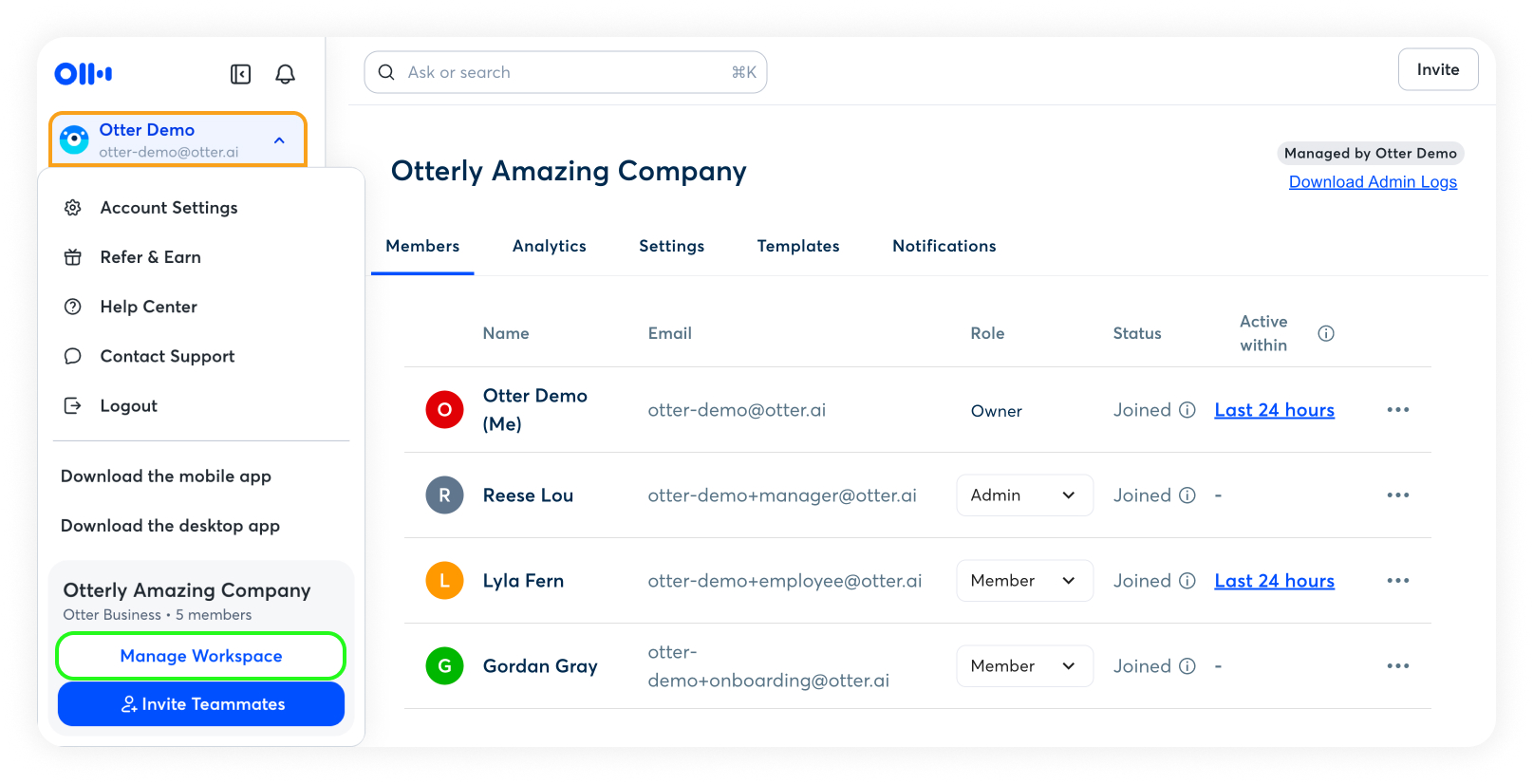 Sign in to Otter.ai as an admin. Click on your profile and select Manage Workspace.